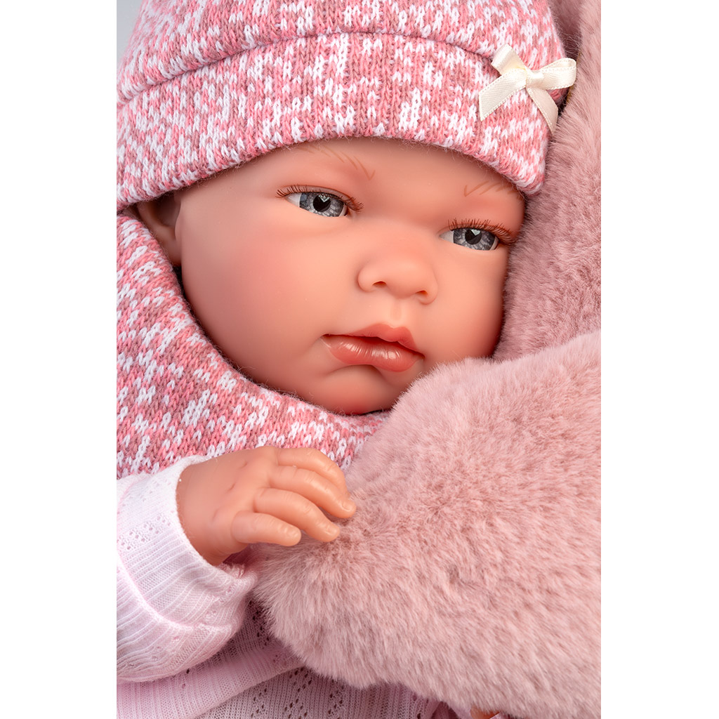 Bábika Llorens: Nica, 40 cm novorodenec so spacím vakom, je naozaj rozkošná voľba, ak chcete, aby vaše dieťa pri starostlivých hrách zažilo radosť z hrania sa s bábikou. Na obrázkoch zobrazená detailne prepracovaná bábika prichádza v mäkkej ružovej pletenej čiapke a šále, čo hre dodáva teplú, domácku atmosféru. Priložený nadýchaný spací vak nielenže poskytuje pohodlné ležisko, ale vďaka svojmu vkladaciemu strihu si deti bábiku ľahko prikryjú a uložia na spanie. Táto súprava je ideálna na hranie rolí a rozvíjanie empatie.