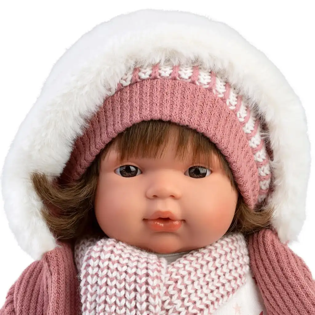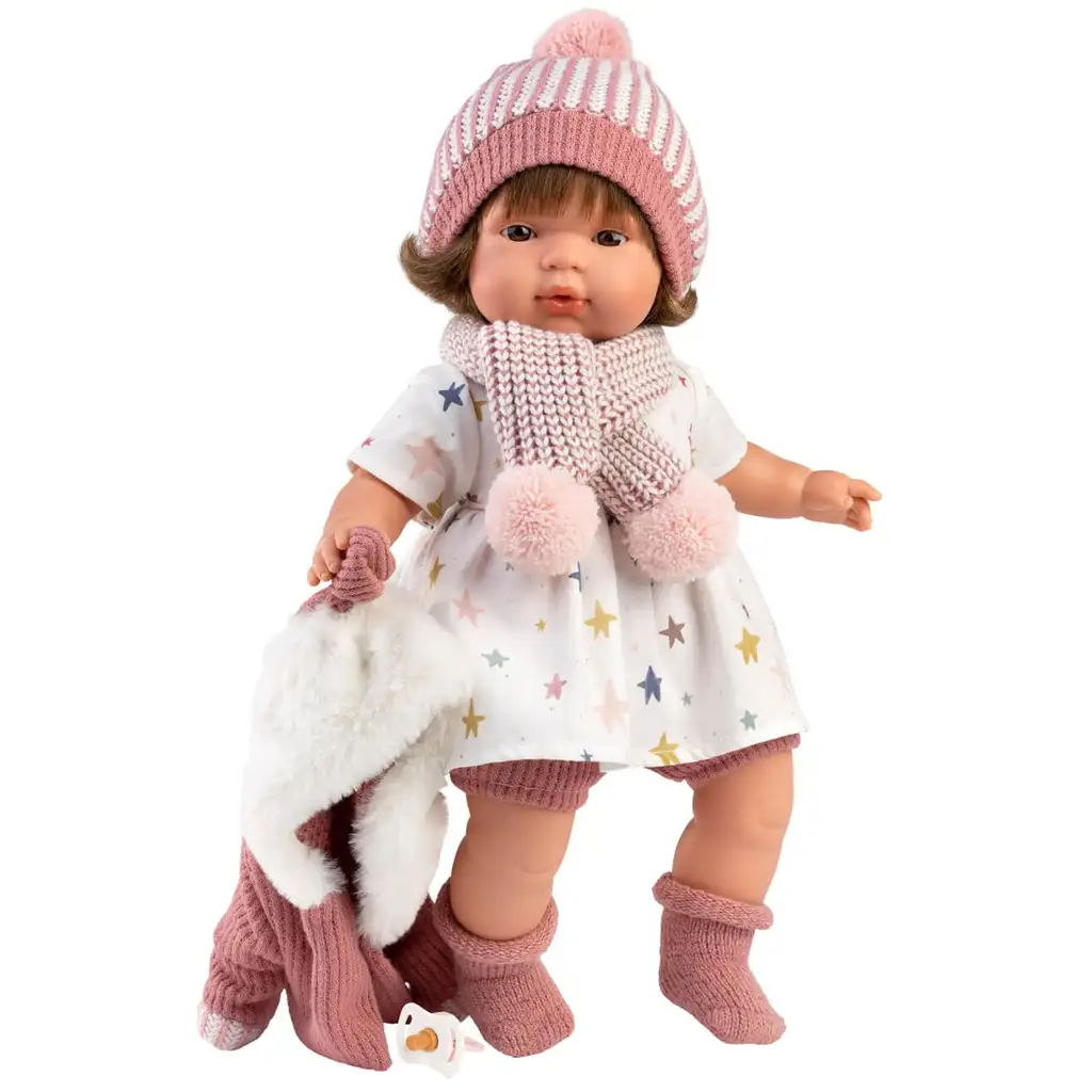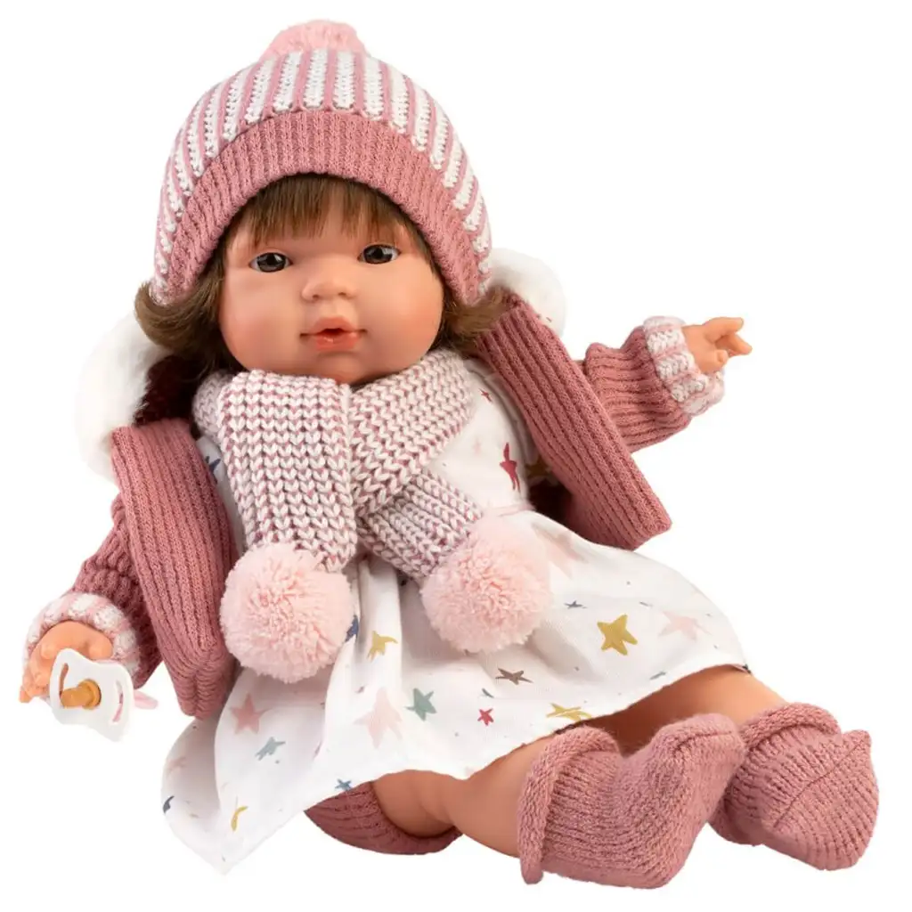 Lola je naozaj milá, 38 cm plačúca bábika z kolekcie Llorens, ktorá určite získa srdce vašej malej dievčatka. Jej šaty s hviezdičkovým vzorom sú hravo farebné, dodávajú jej veselý vzhľad, takže už pri prvom stretnutí vyčarí úsmev na tvárach. K šatám dokonale ladí púdrovo ružová pletená čiapka s bielymi pruhmi a brmbolcom, ako aj šál zakončený dvoma veľkými strapcami, nohavičky a teplé malé ponožky. Súčasťou súpravy je aj mäkký, biely kožušinový ružový kabátik, ktorý Lola drží v ruke, čím sa stáva ešte viac oblečiteľnou a realistickejšou hračkou.