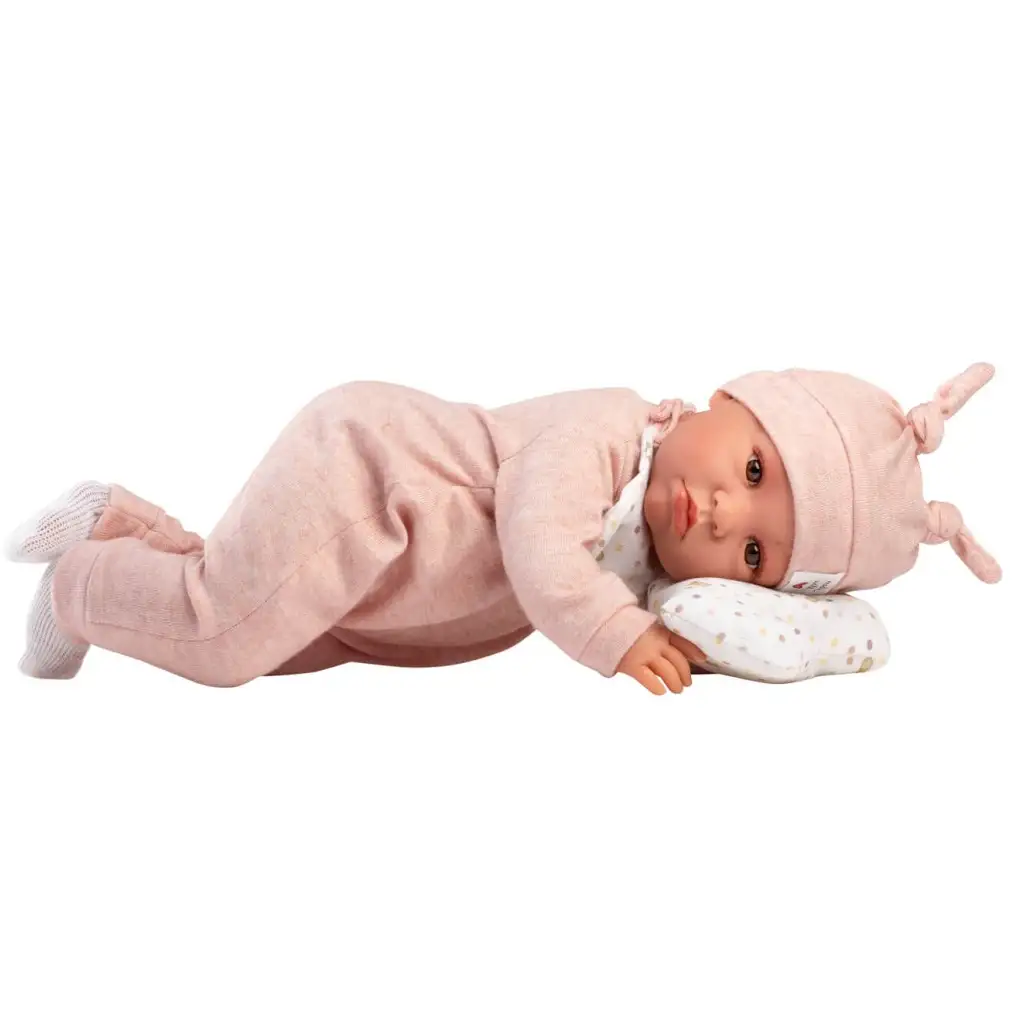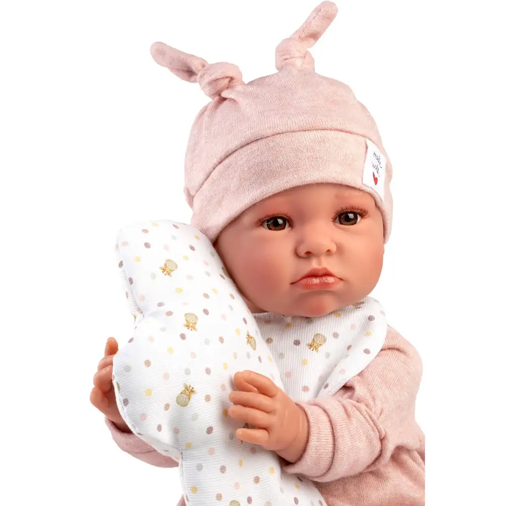 Bábika je oblečená v mäkkom, svetloružovom overale s roztomilou čiapkou s ušami zajačika, čo robí Lunu naozaj výnimočnou a hravou. Na krku nosí bodkovaný podbradník a v lone drží farebne zladený vankúš v tvare oblaku – tento vankúš je nielen dekoratívny, ale aj praktický doplnok pre hranie rolí. Malý pompon na vankúši ešte viac zjemňuje celkový dojem.