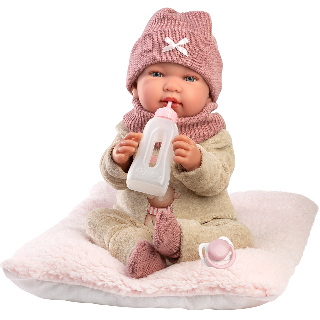 Llorens: Tina, novorodenecká bábika s dĺžkou 44 cm, je dokonalou voľbou, ak pre svoje dieťa hľadáte naozaj milú hračku, ktorá podnecuje starostlivosť. Očarujúci vzhľad bábiky dopĺňa mäkký, teplý overal a k nemu ladúca pletená čiapka s malou mašľou. Na hrudi viditeľný milý medvedíkový motív "I love my family" ešte viac dotvára útulný dojem. Bábika prichádza s mäkkým vankúšikom, takže sa dá pohodlne uložiť a tuliť. Cumlík a fľaštička robia hru ešte realistickejšou, zatiaľ čo vaše dieťa môže zažiť radosť zo starostlivosti.
