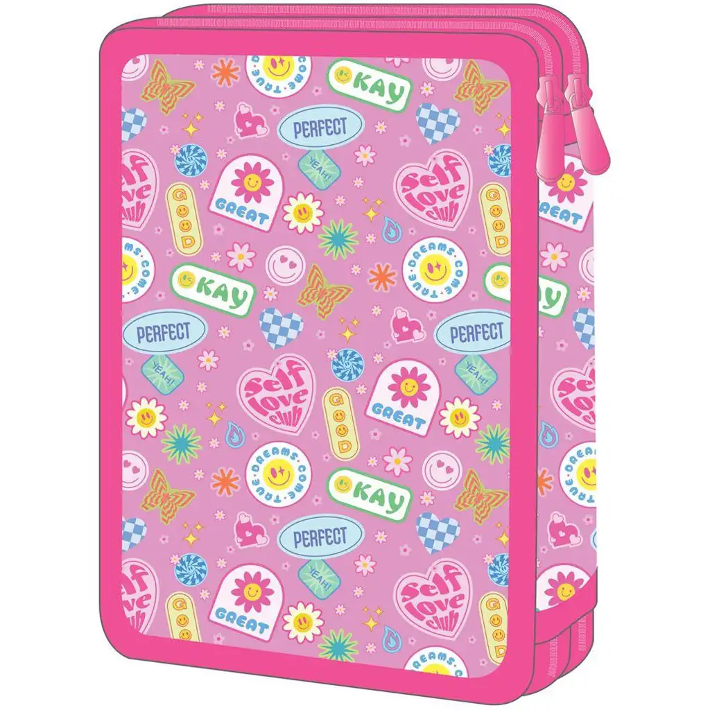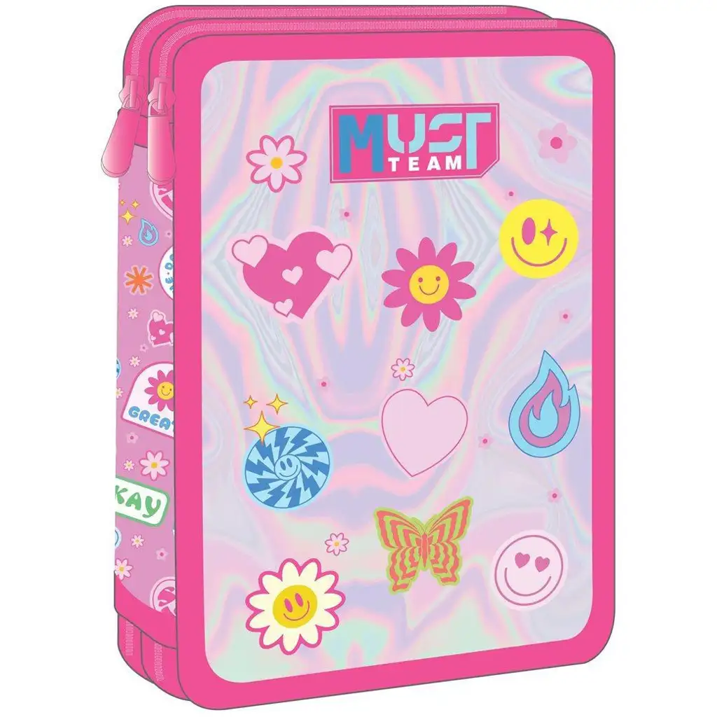 Dvojposchodové plnené puzdro na perá Must Team Good Vibes je perfektnou voľbou, ak chceš, aby tvoje dieťa bolo v škole vždy upravené a štýlové. Holografický efekt obalu a farebné ikony – ako usmievajúce sa slniečko, srdiečko, motýľ, plameň a smajlík – zaručene vyčaria dobrú náladu každé ráno. Dizajn je moderný, svieži a nabitý pozitívnou energiou – presne tým, čo je potrebné na školský deň.