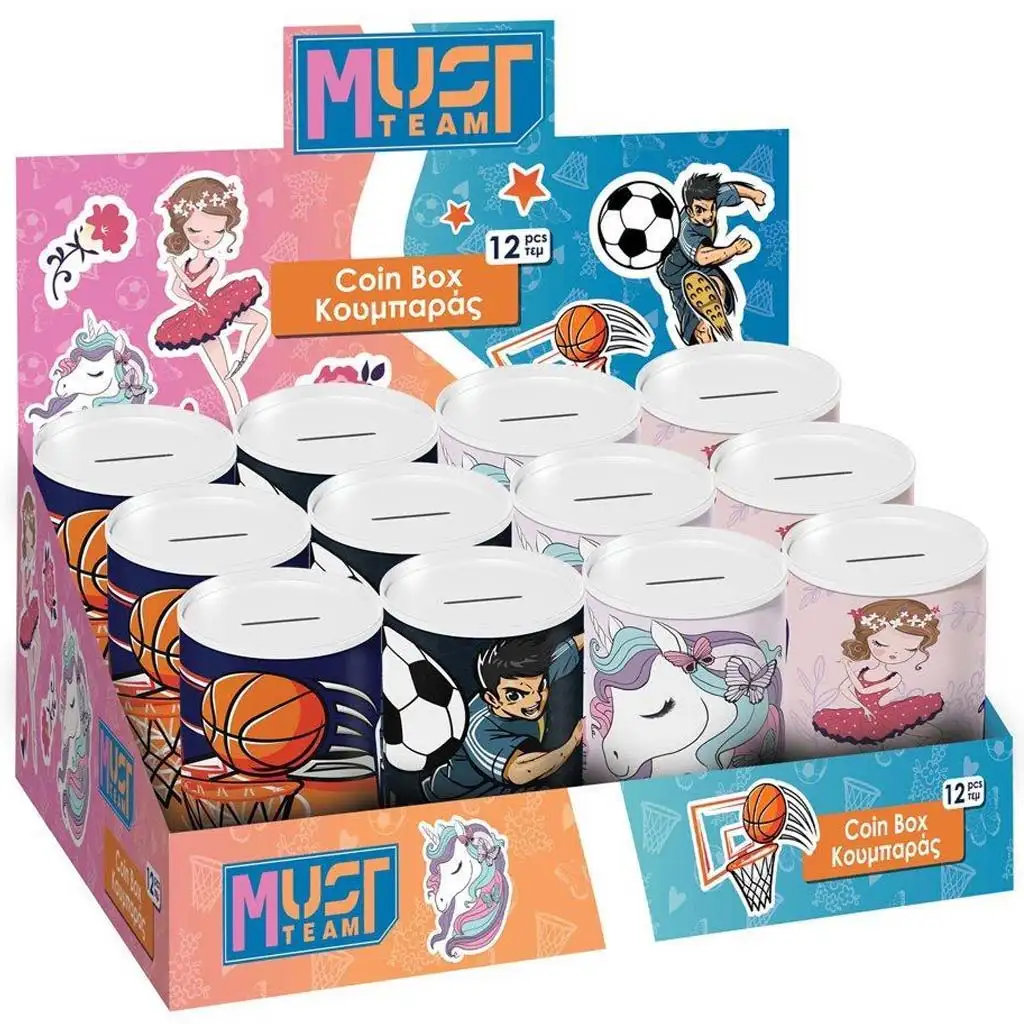 Dovoľte, aby sa deti hravou formou oboznámili so svetom šetrenia pomocou kovovej pokladničky s motívom Must! Tento valcovitý, 10x15 cm veľký pokladničkový box so svojimi veselými a farebnými grafikami spríjemní zbieranie peňazí každému dieťaťu. Kolekcia ponúka viacero vzorov, aby si každé dieťa našlo ten, ktorý najviac vyhovuje jeho štýlu: futbalový, basketbalový, s jednorožcom, baletkou a ďalšími roztomilými postavičkami.
