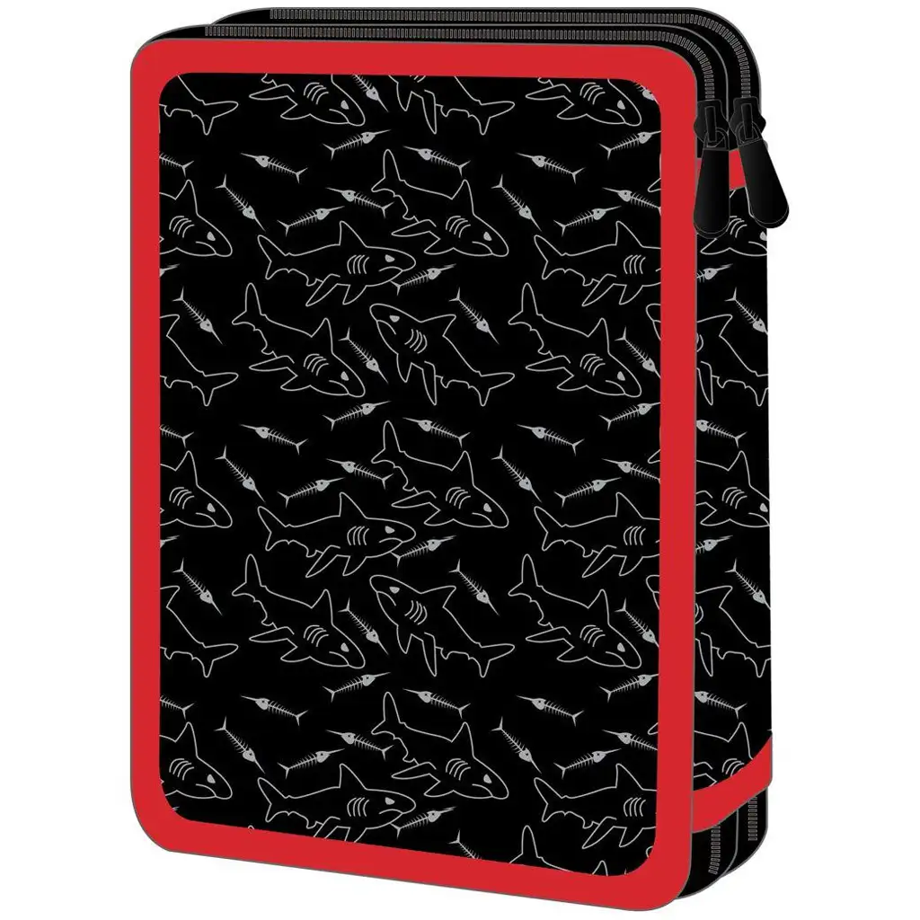 Peračník Must Team Shark s motívom žraloka je naozaj štýlovou voľbou pre deti, ktoré majú rady vzrušujúci, odvážny dizajn a záleží im na poriadku v školských potrebách. Výrazná žraločia tvár na prednej strane peračníka určite upúta pozornosť, zatiaľ čo zadná strana s motívom plávajúcich žralokov a rybích kostí na čiernom podklade ešte viac podčiarkuje „drsnú“ atmosféru.