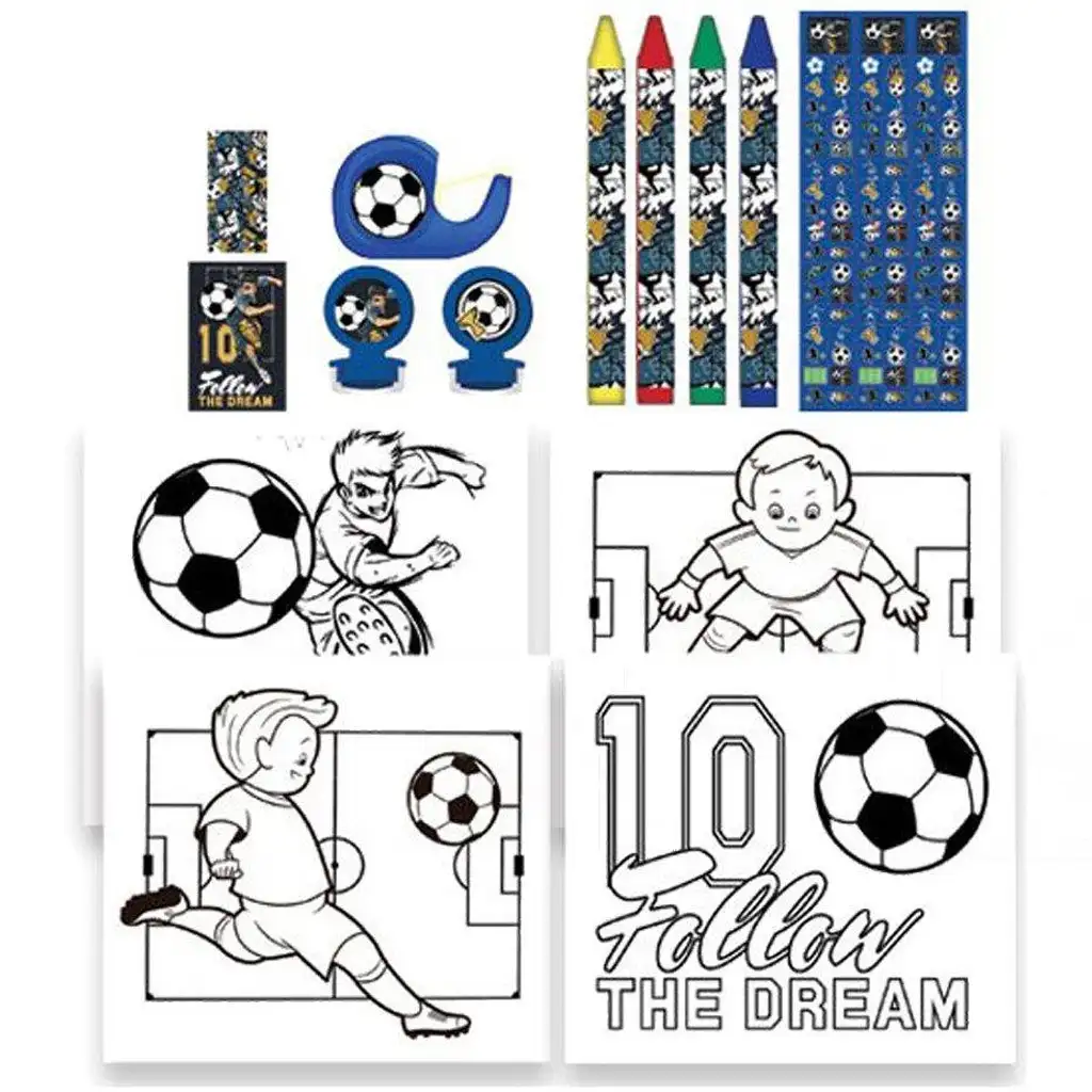 Hlavným prvkom sady je špirálový omaľovánkový blok so štýlovým futbalovým obalom, ktorý dopĺňajú 4 žiarivo farebné voskovky (žltá, červená, zelená, modrá). V balení nájdete tiež gumu na gumovanie, strúhadlo, dávkovač dekoračnej pásky, futbalové pečiatky a parádne samolepky, ktorými si malí futbaloví fanúšikovia môžu svoje výtvory ešte viac ozdobiť. Na omaľovávacích listoch sa nachádzajú rôzne futbalové scény: strely, oslavy gólov aj výborné brankárske zákroky – všetko, čo sa môže na ihrisku stať, teraz ožíva aj v tvorivej podobe.