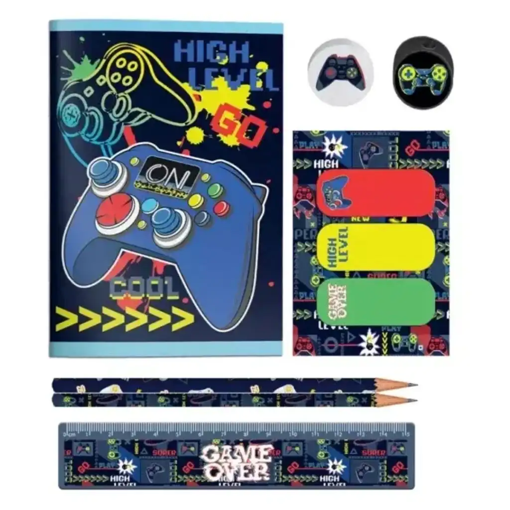 V sade sa nachádza malý zošit, dve grafitové ceruzky, pravítko, guma, strúhadlo a tri farebné záložky – to všetko uložené v odolnom puzdre na zips. Puzdro sa jednoducho zmestí do školskej tašky, takže všetky dôležité pomôcky budú vždy po ruke. Dizajn s tmavým základom, neonovými motívmi a grafikou ovládača pôsobí skutočne štýlovo – toto si tvoj chlapec zamiluje!