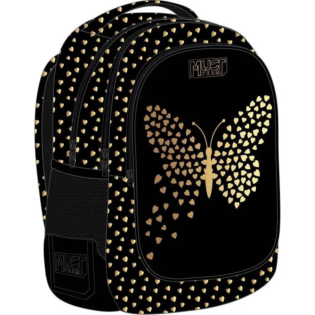 Štýlový, jedinečný a praktický – to je Luna: Must batoh s oblými tvarmi a tromi priehradkami v motýlikovom prevedení, ktorý si zamiluje každá módne cítiaca školáčka. Elegantný čierny základ oživuje nádherný vzor motýľa vytvorený zo zlatých srdiečok, ktorý taške dodáva moderný a výnimočný vzhľad. Nie je len krásny, ale aj mimoriadne praktický na každodenné používanie v škole.