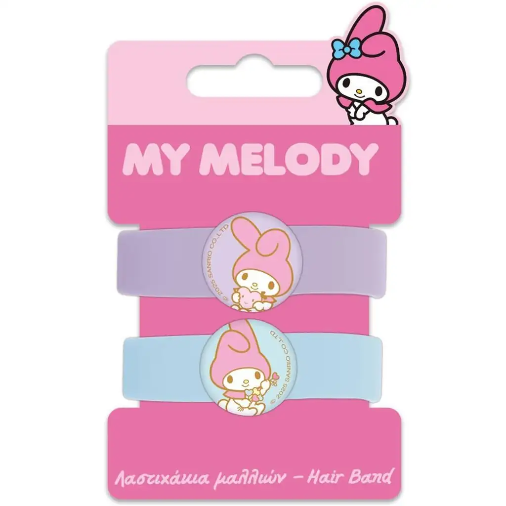 Sada obsahuje jednu pastelovo fialovú a jednu svetlomodrú gumičku, pričom v strede každej z nich je plastická figúrka My Melody. Na fialovej gumičke objíma My Melody plyšového medvedíka, zatiaľ čo na svetlomodrej verzii sa usmieva s kyticou kvetov – obe vyžarujú pokojnú a milú atmosféru. Pružný, mäkký materiál a vlasom priateľský dizajn zabezpečujú, že gumičky netrhajú vlasy, takže ich deti môžu pohodlne nosiť po celý deň.