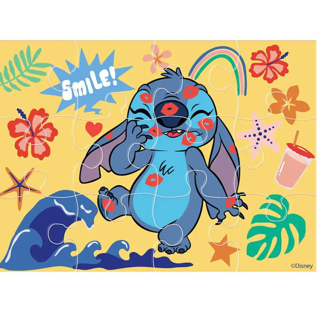 V krabici sa nachádzajú štyri rôzne puzzle: jedno s 12 dielikmi, jedno s 15, jedno s 20 a jedno s 24 dielikmi. Táto rozmanitosť výborne podporuje rozvoj jemnej motoriky, rozpoznávanie tvarov a koncentráciu už od 3 rokov. Jasné farby skladaniek, tropická atmosféra a roztomilý úsmev Stitch zaručene upútajú pozornosť detí.