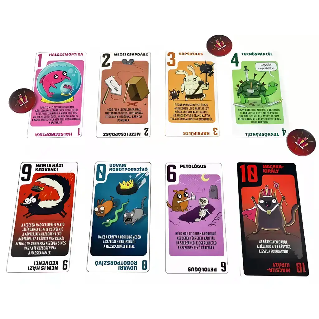 V hre musíš v každom kole zahrať kartu, ktorá má rôzne účinky. Niektoré karty predstavujú priamy útok na iných hráčov, zatiaľ čo iné poskytujú ochranu alebo umožňujú pozrieť si karty ostatných hráčov a vytvoriť stratégiu. Tvojím cieľom je vyradiť ostatných alebo mať na konci kola najsilnejšiu kartu. Vďaka jednoduchým pravidlám sa Cicaharc rýchlo naučíš, takže už od prvej hry poskytuje dynamický a zábavný zážitok.