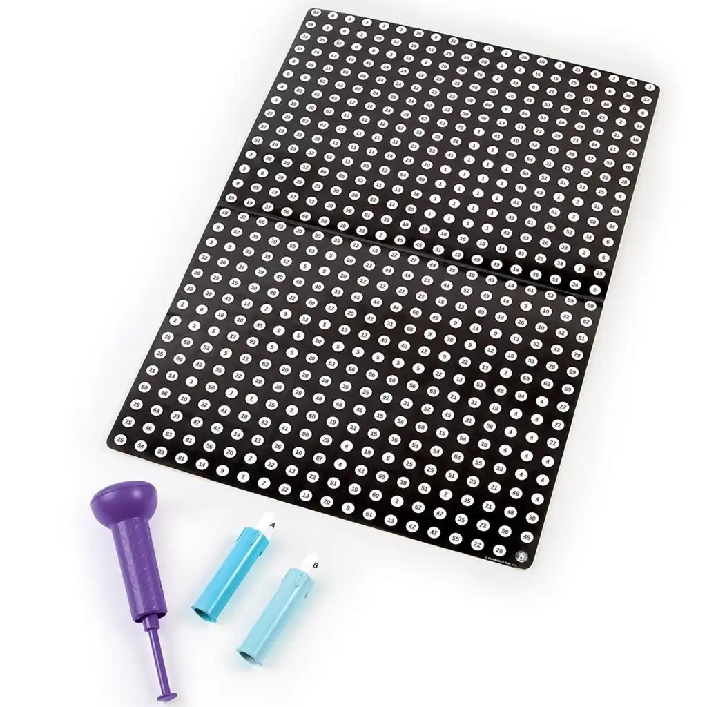 Bodkovacia technika je mimoriadne uspokojujúca a relaxačná, keďže je jednoduchá, no zároveň pôsobivá – ideálna pre deti, ktoré milujú vizuálne tvorenie a precíznu prácu. Súprava obsahuje všetko, čo deti potrebujú na tvorenie: plagát, pečiatku a dve atramentové kazety, ktoré vyplnia vopred vyznačené bodky žiarivými a trblietavými farbami.