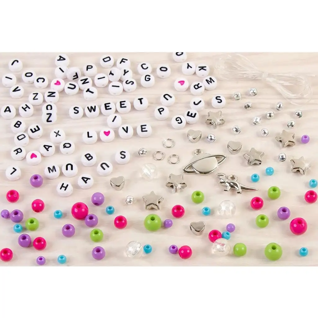 V balení sa nachádza 60 abecedných korálikov, takže si dieťa môže zostaviť akékoľvek slovo alebo meno, či už je to jeho vlastné meno, obľúbené slovo, inšpiratívny odkaz alebo tajný kód medzi kamarátkami. 70 farebných korálikov (ružových, fialových, zelených, modrých a priesvitných) sa dá skvele kombinovať s písmenkami a výnimočné kovové prívesky v tvare hviezdy, srdca, planéty alebo dinosaura ešte viac zvýraznia výsledné šperky.