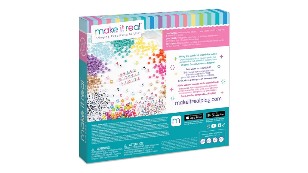 Súprava obsahuje iba korálky a šnúrku, takže budete potrebovať nožnice, aby ste šnúrku nastrihali na požadovanú dĺžku. Pre podrobné návody a projektové nápady navštívte webovú stránku Make It Real alebo si stiahnite ich bezplatnú aplikáciu z obchodu Google Play alebo Apple App Store.