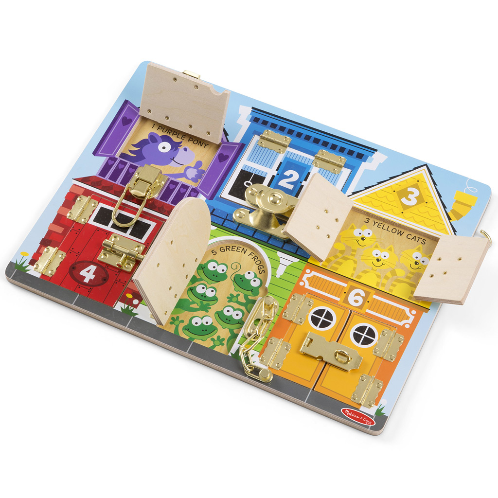 Drevená hracia doska Melissa & Doug Zámky a západky na rozvoj zručností poskytuje skutočný zážitok z objavovania pre vaše dieťa. Na farebných domčekoch čakajú rôzne zámky, západky a visacie zámky, aby ich malé ručičky otvorili, pričom za každými dvierkami sa skrývajú veselé zvieratká. Táto hra nie je len zábavná, ale pomáha rozvíjať jemnú motoriku, schopnosť riešiť problémy a rozpoznávanie čísel a farieb. Pevné drevené prevedenie zaručuje dlhodobé používanie, takže je ideálnou voľbou pre zvedavé, aktívne deti. Perfektná na hranie doma alebo na cesty, pretože upúta pozornosť a poskytuje pocit úspechu pri každom otvorenom dvierku.