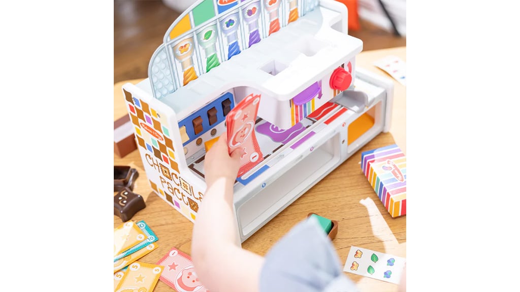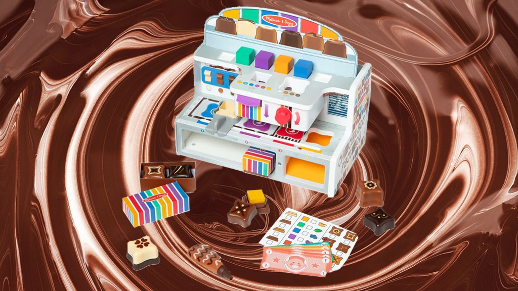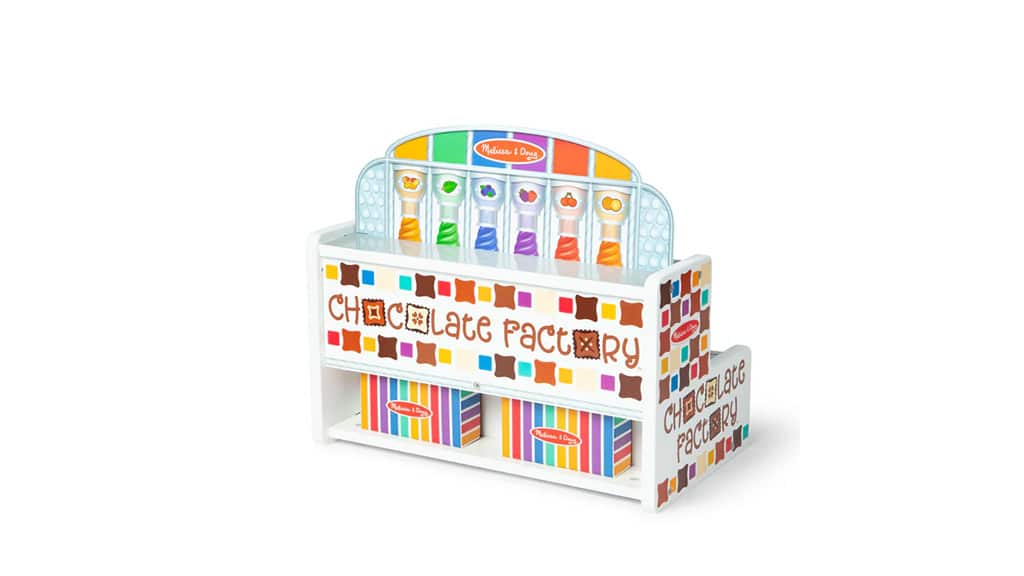 Melissa & Doug čokoládová továreň povzbudzuje deti k imaginárnej hre pomocou cukrárskej továrne a cukrárne. Deti môžu miešať a kombinovať plastové cukríkové škrupiny, polevy a náplne pomocou posuvného dopravníka, spínačov, pák a koliesok, aby sa cukríky dostali na svoje miesto. Sada obsahuje šesť základov, vrchnáky, farebné kocky, dve darčekové krabičky, trubice, tabule, kartu s aktivitami a hracie peniaze. Deti si môžu vytvárať vlastné cukríky, vyplňovať a spracovávať objednávky. Táto hra nie je len zábavná, ale rozvíja aj kreativitu a jemnú motoriku, zatiaľ čo sa deti učia kombinovať farby a tvary, ako aj základy obchodného myslenia. Počas hry deti zažijú aj radosť z tímovej práce, keď spoločne pracujú na výrobe cukríkov a plnení objednávok.