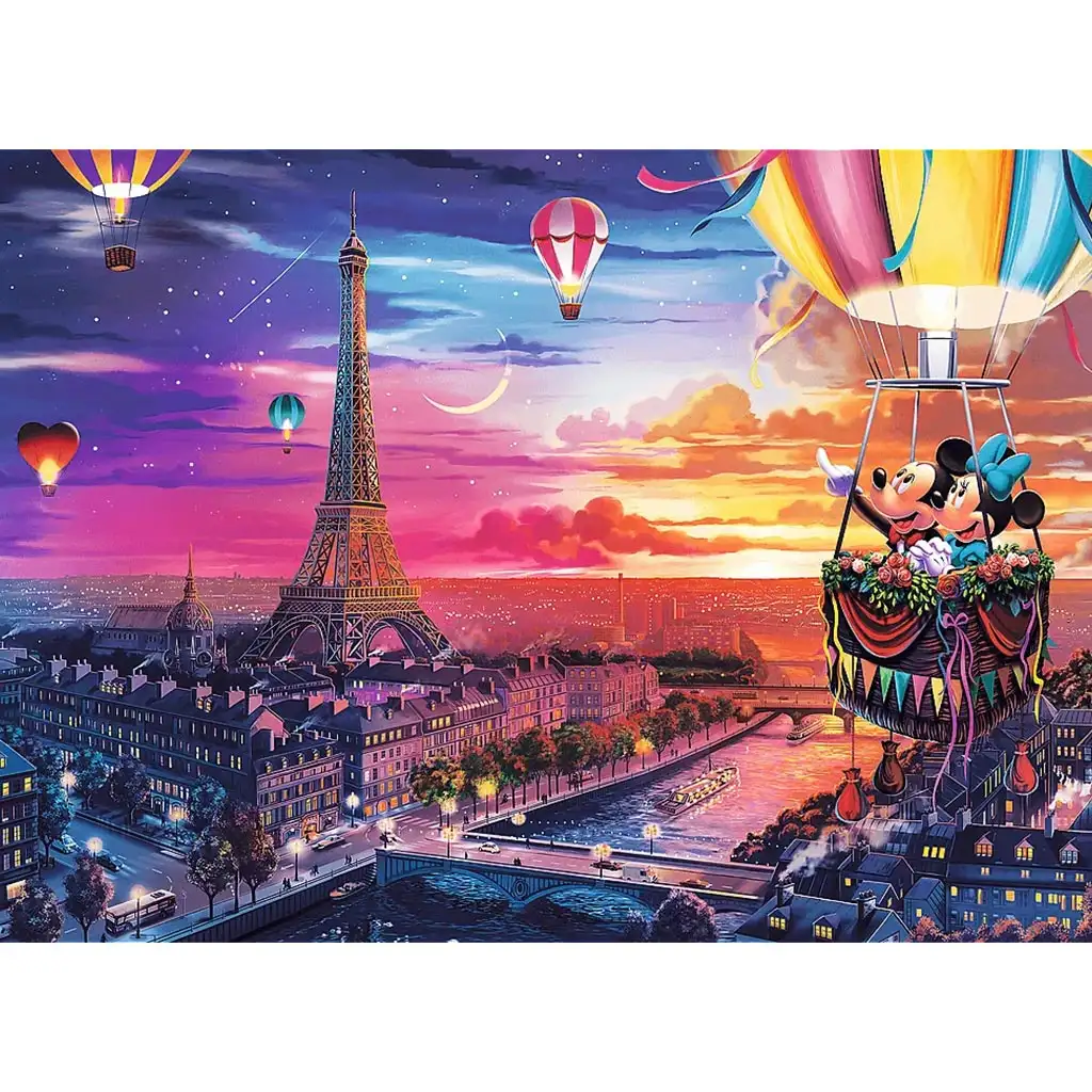 Dovoľte, aby vás Mickey a Minnie preniesli do mesta romantiky s touto nádhernou, 1000-dielnou puzzle! Puzzle „Disney – Mickey a Minnie v Paríži“ zobrazuje magický večer v meste svetiel: dvojica prelieta oblohou v teplovzdušnom balóne pri západe slnka, zatiaľ čo pod nimi žiaria nádherné budovy Paríža na brehu Seiny, vrátane Eiffelovej veže. Farebné ladenie obrázka je hrejivé, útulné, plné balónov, hviezd a rozprávkovej atmosféry.