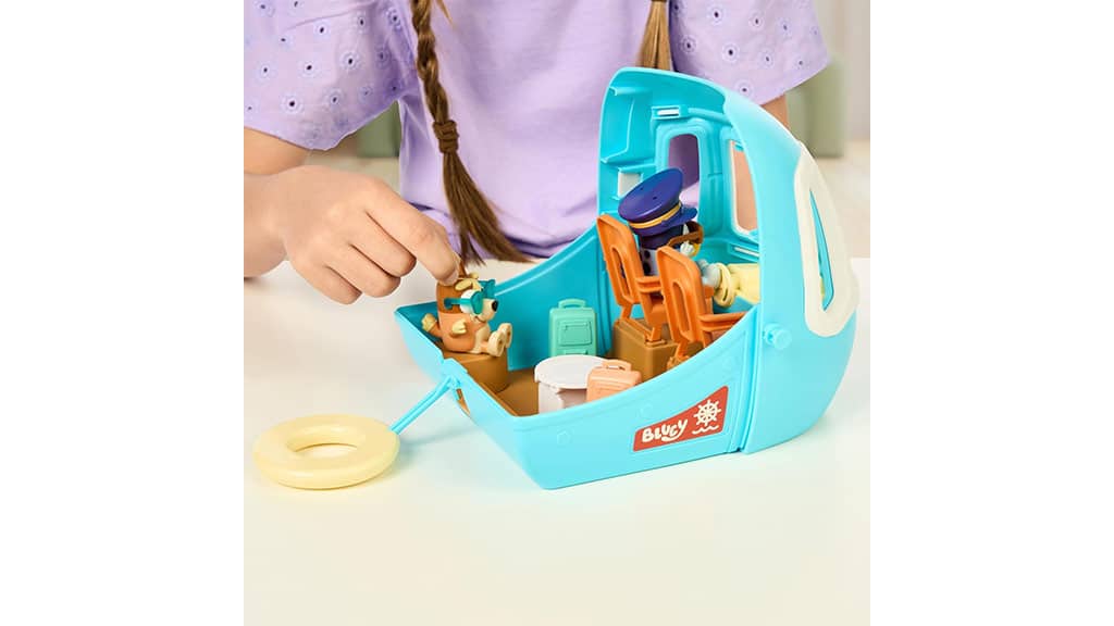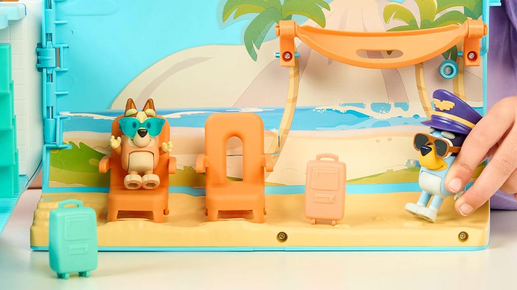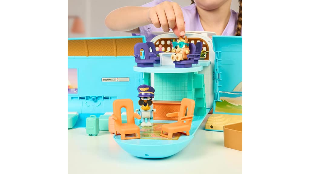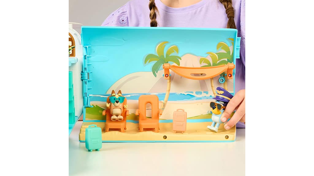Navrhnuté pre deti od 3 rokov, táto hracia súprava Bluey vezme deti na tropické dobrodružstvo s tromi hernými režimami: lietadlom, loďou s pripojeným plávacím kruhom a letoviskom, ktoré obsahuje štvorlôžkovú hotelovú izbu a pláž! Súprava obsahuje aj dve exkluzívne figúrky – Bluey s pilotnou čiapkou a slnečnými okuliarmi a Bingo so slnečnými okuliarmi – s ktorými môžu deti prehrávať scény. Keď deti stlačia tlačidlo na zadnej strane hracej súpravy, prehrá viac ako 25 rôznych zvukov, fráz a hudby zo šou. Deti sa môžu skutočne zúčastniť dobrodružstva s austrálskym pasom, ku ktorému patrí aj nálepka na ozdobenie!