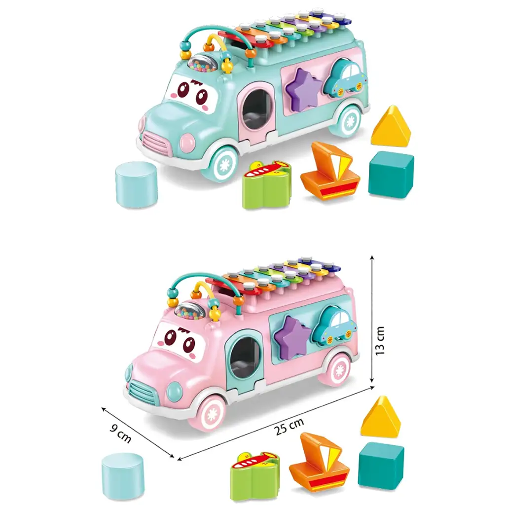 Na prednej časti autobusu sa nachádza zvonček a guľôčková dráha, ako aj tvarový vkladač na jeho boku, ktoré pomáhajú deťom rozvíjať jemnú motoriku a zručnosť. Tieto hračky povzbudzujú malých k rozpoznávaniu tvarov a rozvoju schopnosti riešiť problémy.