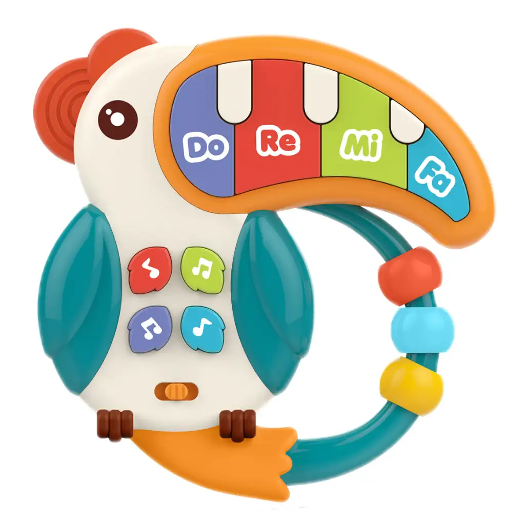 Dizajn tukanovho klavíra je mimoriadne praktický a detský. Vďaka kruhu môžu deti ľahko chytiť a ovládať hračku, takže si s ňou môžu hrať samostatne, čím si rozvíjajú zručnosti a koordinačné schopnosti.