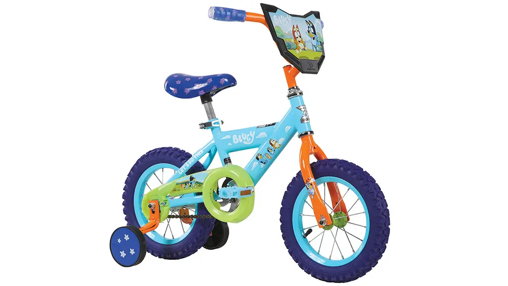 Tento 12-palcový bicykel sa pýši živými modrými, zelenými a oranžovými farbami a je plný grafík inšpirovaných Bluey. Deti sa môžu učiť jazdiť na bicykli s odnímateľnými tréningovými kolieskami a ľahko použiteľnými coaster brzdami.
