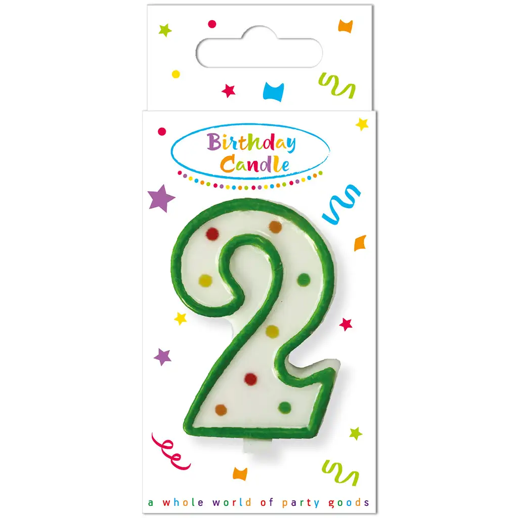 Oslávte druhé narodeniny vášho dieťaťa s touto veselou a farebnou narodeninovou sviečkou s číslom 2, ktorá zaručene vyčarí úsmev na tvári každého! Sviečka zdobená viacfarebnými bodkami na bielom podklade má výrazný zelený okraj, takže skvele vynikne na akejkoľvek torte, muffine alebo koláči.