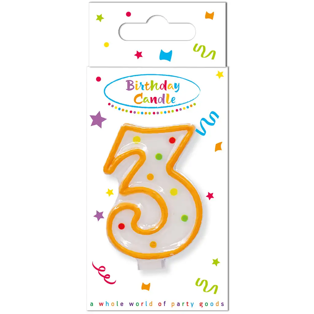 Blíži sa veľký deň? Prekvapte svoje dieťa naozaj veselou narodeninovou tortovou ozdobou – sviečka s číslom 3 s bodkami je perfektnou voľbou na oslavu tretích narodenín! Biela základňa sviečky je zdobená farebnými bodkami a oranžový obrys jej dodáva naozaj živý a hravý vzhľad.