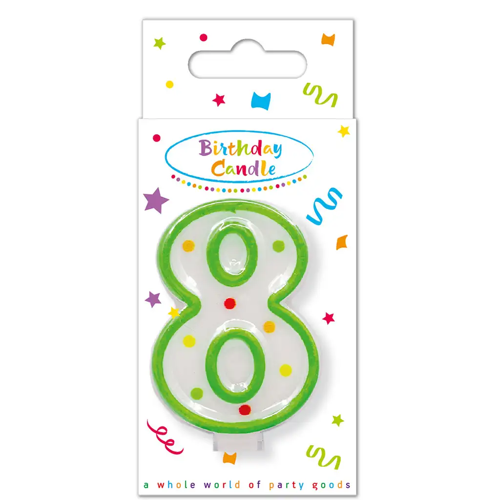 Pripravujete sa na ôsme narodeniny? Potom je táto veselá a farebná bodkovaná narodeninová sviečka s číslom 8 dokonalou voľbou na tortu! Sviečka má biely základ zdobený živými bodkami, ktoré sú orámované sviežim zeleným okrajom. Tento dizajn sa páči nielen deťom, ale ľahko sa zladí aj s dekoráciou, či už ide o zvieraciu, superhrdinskú alebo princeznovskú párty.