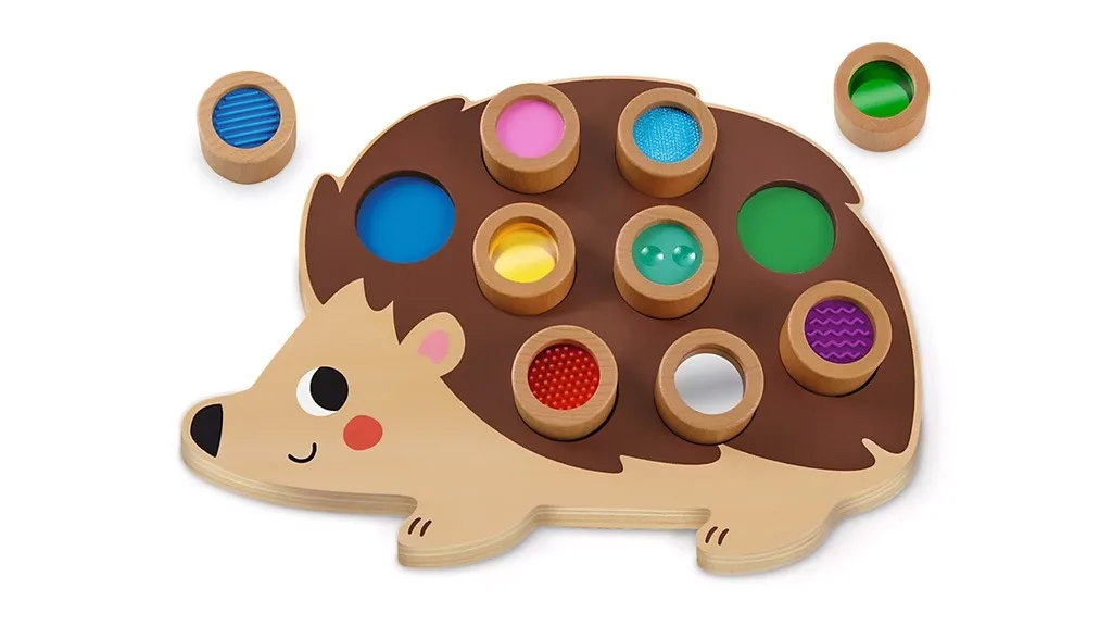 Táto puzzle doska v tvare ježka obsahuje "bodky", ktorých farby zodpovedajú kruhom na doske. Do bodiek sú vložené textúry a vizuálne prvky pre senzorický zážitok.Malí milovníci zvierat môžu nájsť jedinečnú senzorickú zábavu v Senzorickom ježkovi Objavovanie & Párovanie. Tento ježko vo forme drevenej puzzle obsahuje množstvo textúr, "bodiek", ktoré sú hladké, vrúbkované, zrkadlové a farebné. Deti môžu vyriešiť puzzle tak, že uchopia bodku a spárujú ju s rovnakou farbou na doske.