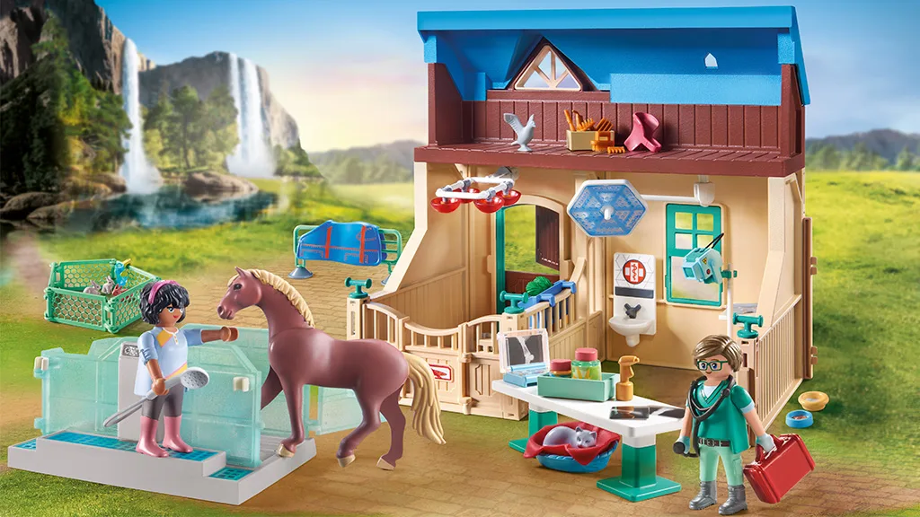 Táto sada obsahuje 164 dielov a obsahuje všetko, čo deti potrebujú na vytvorenie vlastnej veterinárnej kliniky na Waterfall Ranch pre starostlivosť o kobyly, žriebätá a ďalšie zvieratá. Ideálne pre imaginatívnu hru, sada obsahuje hračkový röntgen so snímkami, bežecký pás pre kone, bazén pre vodnú terapiu a oveľa viac.