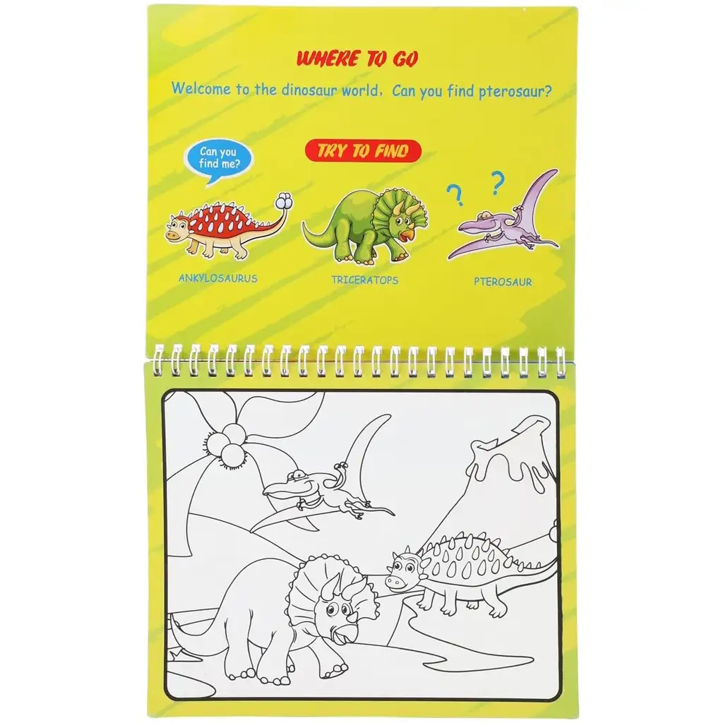 Špirálový pracovný zošit obsahuje štyri vzrušujúce scény, z ktorých každá vedie do sveta roztomilého dinosaura. Deti môžu nielen vyfarbovať stránky, ale nájdu tu aj rôzne hravé úlohy – napríklad musia nájsť určité dinosaury, ako Ankylosaurus, Triceratops či lietajúci Pterosaurus. Tým sa rozvíja pozorovacie schopnosti a koncentrácia, pričom ich fantázia môže naplno rozkvitnúť.