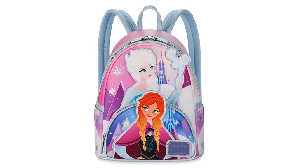 Postavy Elsa a Anna z Disneyho Mrazivej kráľovnej sú v centre pozornosti na tomto batohu. Mini batoh je vyrobený z imitácie kože a obsahuje strieborné fóliové vločky, dvojité zipsy na hlavnú priehradku a obrazovú grafiku.