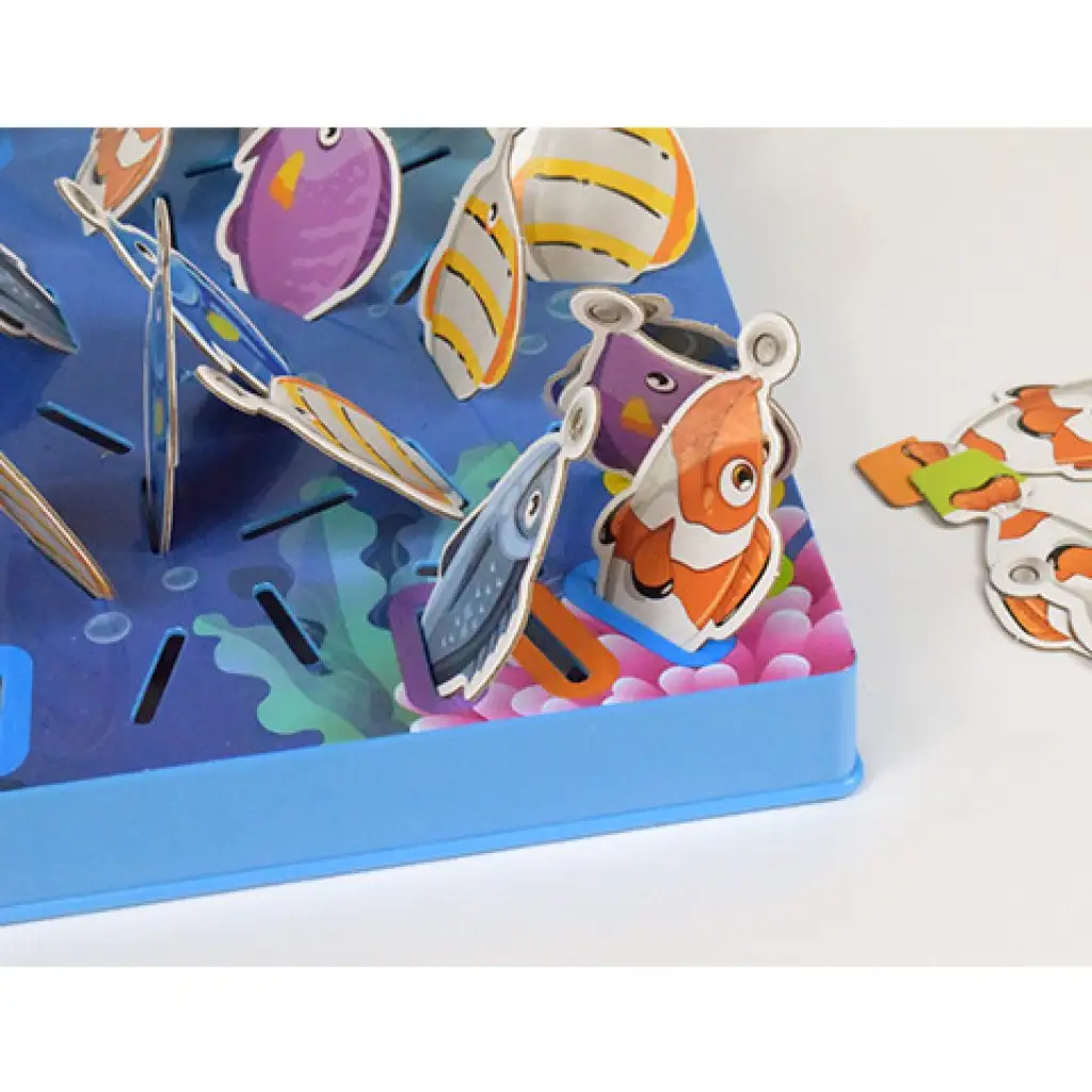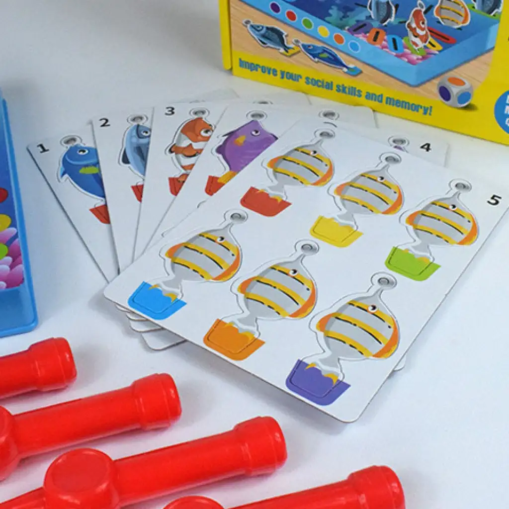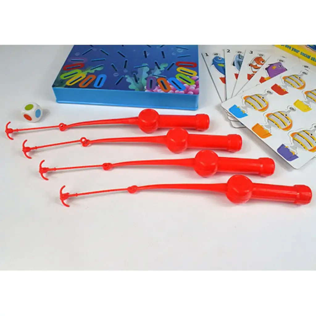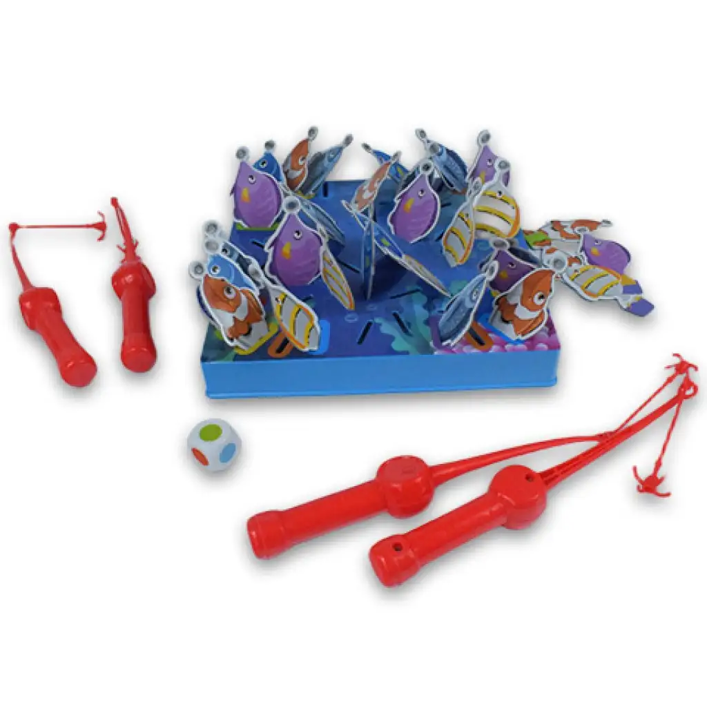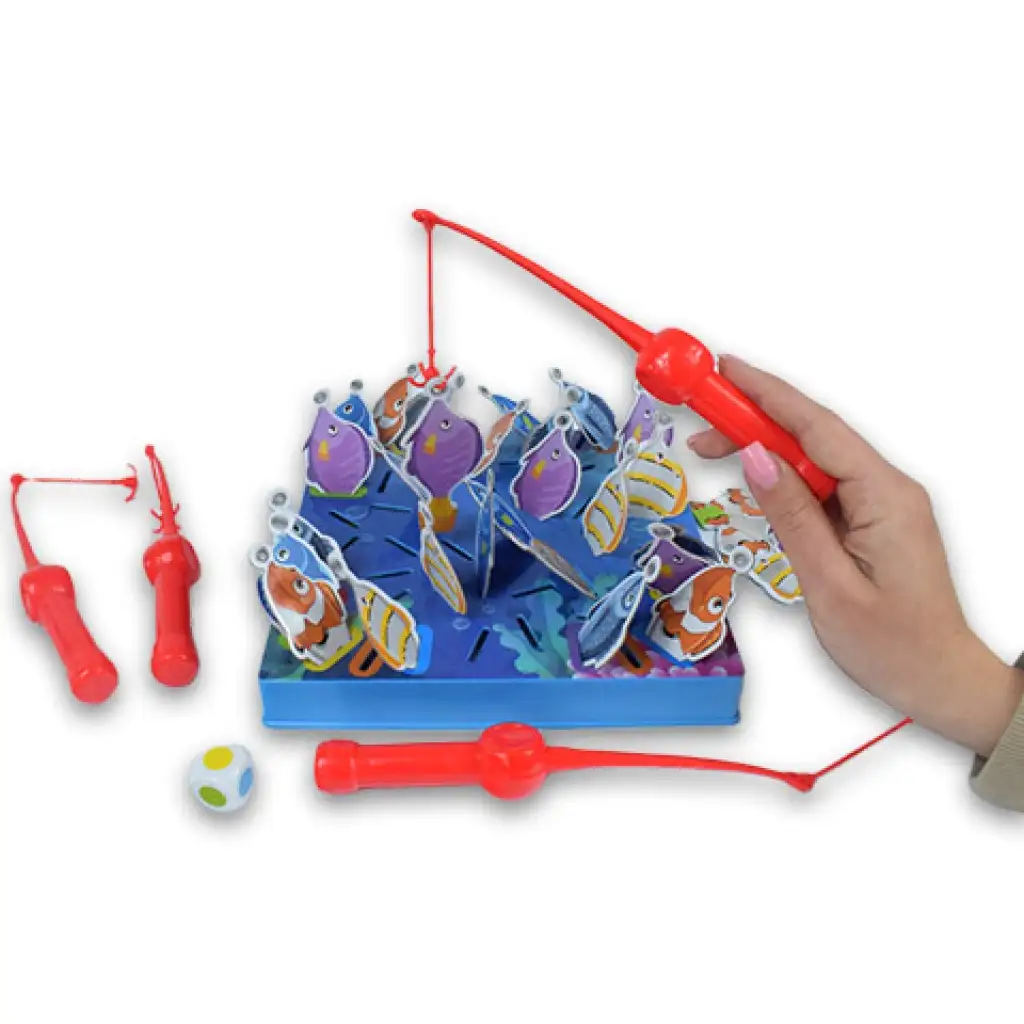 Priniesli sme super spoločenskú hru, ktorú si užije celá rodina, pretože je zábavná, ale zároveň si vyžaduje aj pamäť. Hra pozostáva z hracej dosky s rozmermi 20x20 cm, rýb, rybárskych prútov a kocky. Podstatou hry je, že na spodnej strane každej ryby je viditeľná farba, ktorá po umiestnení na dosku už nie je viditeľná - okrem rýb v štyroch rohoch - a úlohou je vyloviť rybu s farbou, ktorú ukáže kocka, pomocou rybárskeho prútu. Ak sa pomýlite vo farbe, nasleduje ďalší hráč, a na konci vyhráva ten, kto vylovil najviac rýb. Hra je teda nielen zábavná, ale aj precvičuje mozog a vyžaduje si aj zručnosť. Získajte ju a hra sa môže začať.