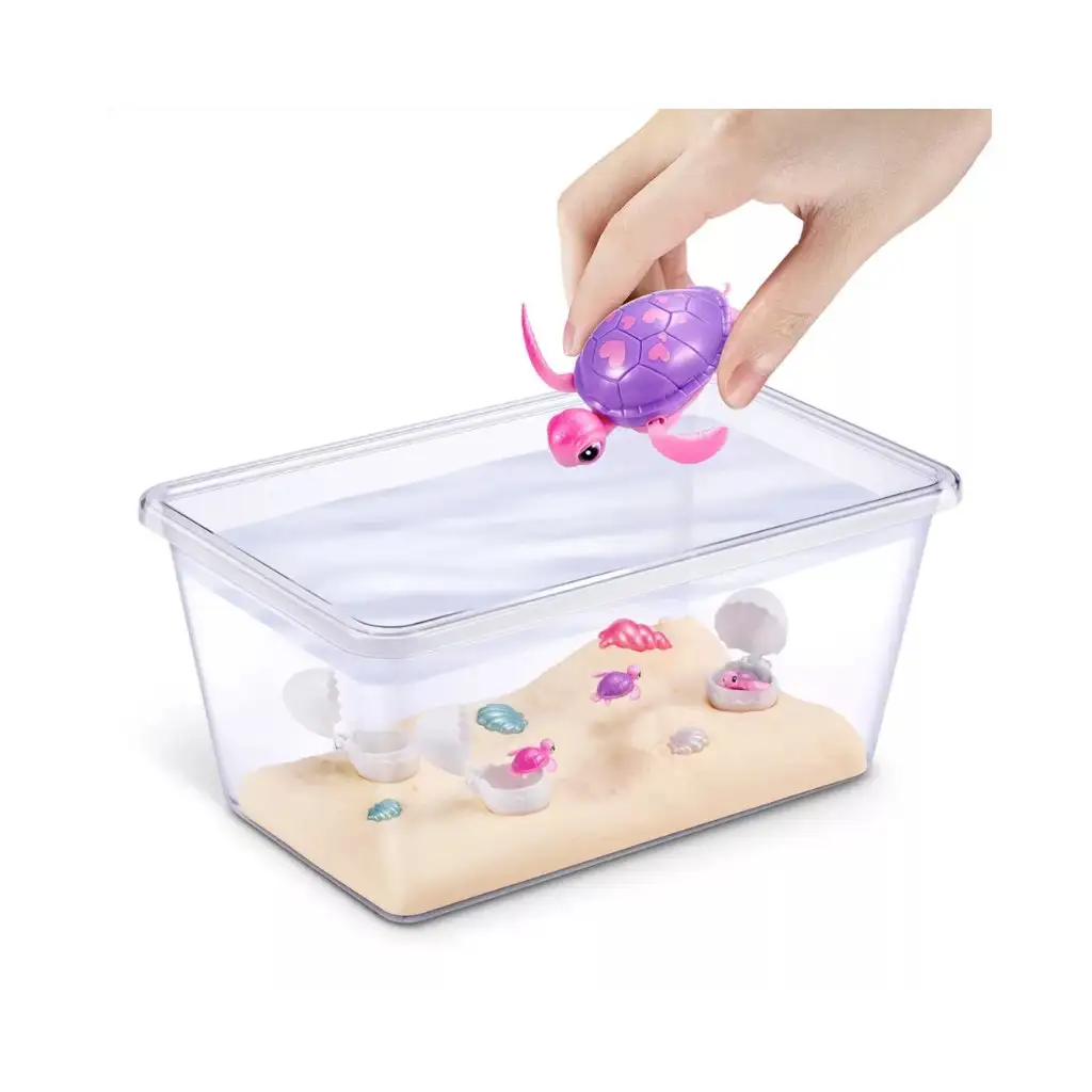 Veľká mama korytnačka je hlavnou postavou sady, ktorá ožije, keď ju položíš do vody, a naozaj začne plávať. Stačí naplniť akvárium vodou a môžeš pozorovať, ako sa korytnačka pôvabne kĺže vo vode. No vie nielen plávať – vie chodiť aj po súši, takže sa o ňu deti môžu starať vo vode aj na brehu.