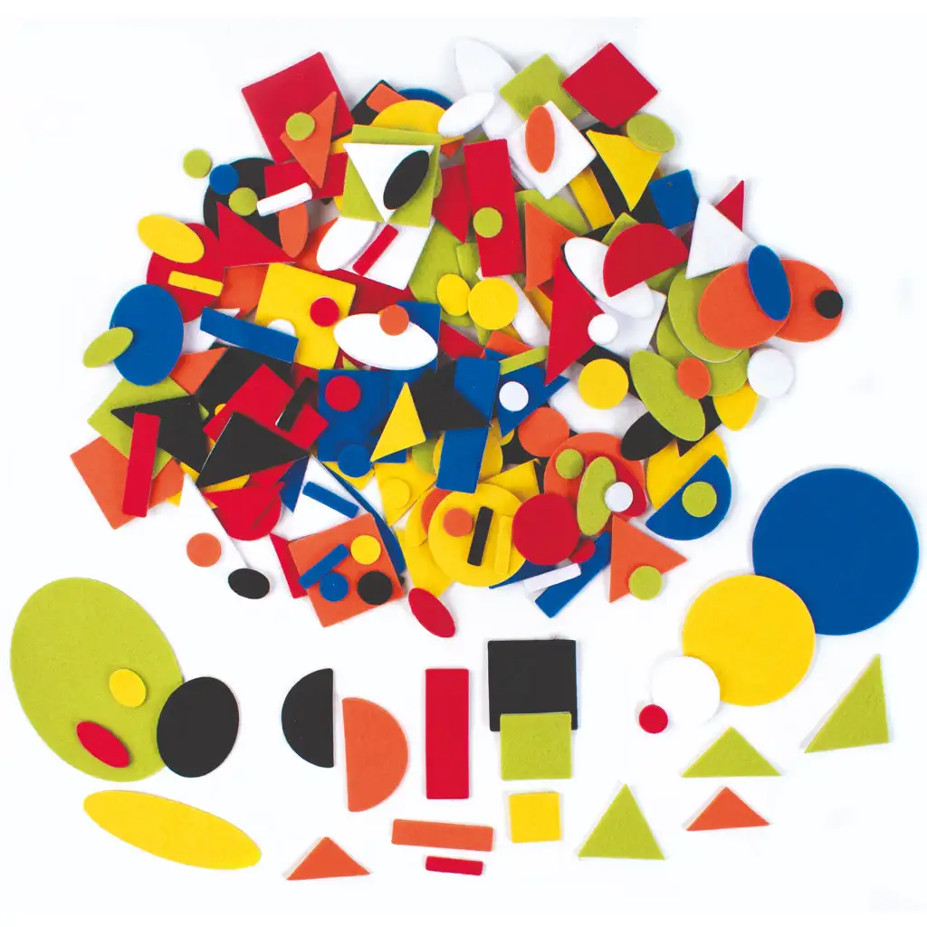 Geometrické tvary z filcu s lepiacou spodnou stranou ponúkajú riešenie pre kreatívne projekty. Najbežnejšie tvary, ako sú kruhy, štvorce, obdĺžniky a trojuholníky, môžete ľahko nalepiť na požadovaný povrch.