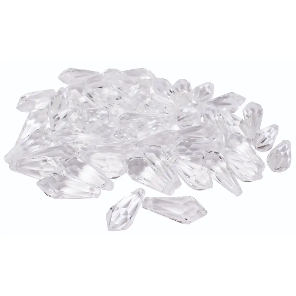 Tieto krištáľe sú vyrobené z vysoko kvalitného plastu, ktorý je ľahký a odolný. Podlhovastý tvar a priehľadný materiál poskytujú osobitý vizuálny efekt, ktorý vďaka lomu svetla vytvára úžasný lesk.