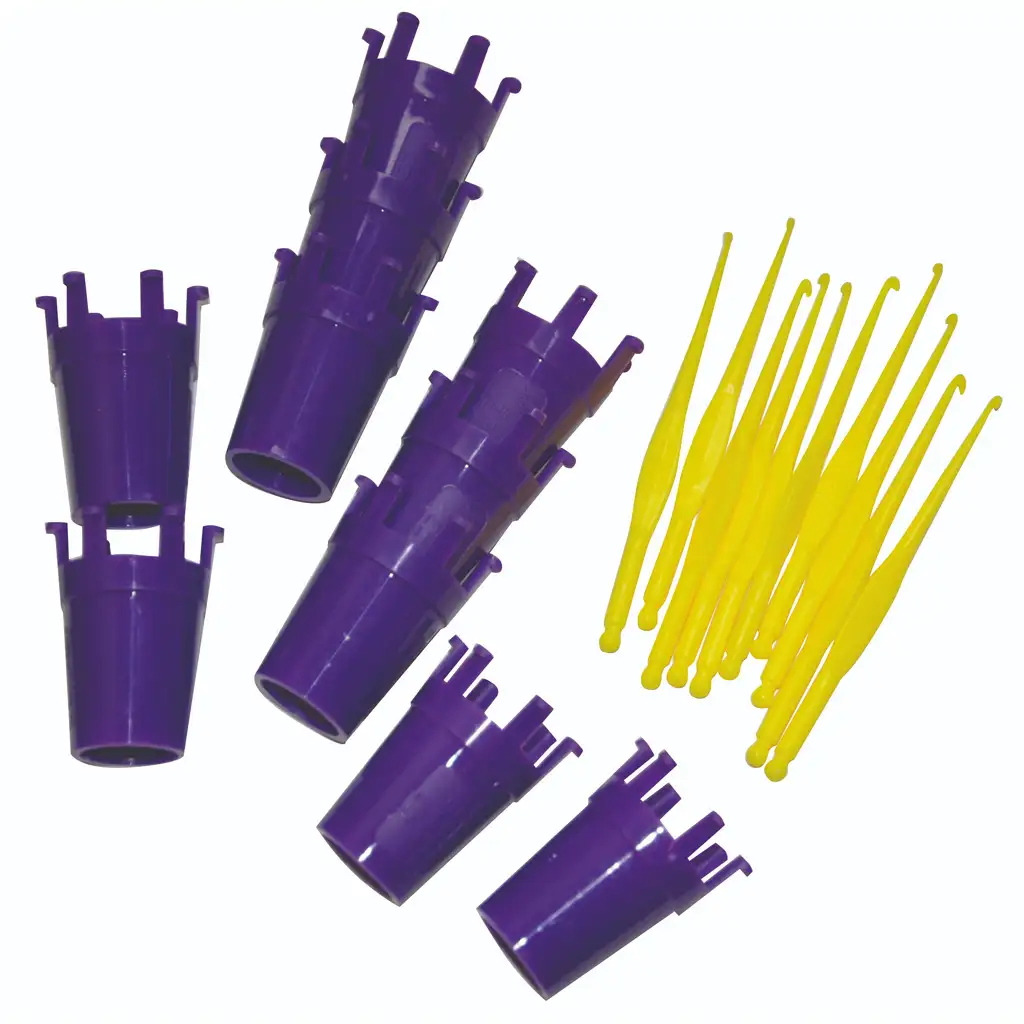 Veľkosť krúžkov je 30 x 40 mm, zatiaľ čo veľkosť háčikov je 85 x 4 mm. Všetky nástroje sú dostupné vo fialovej a žltej farbe, čo pridáva viac farieb a rozmanitosti vašim výtvorom.