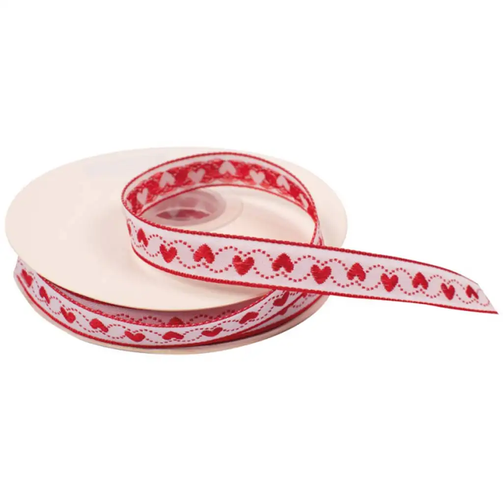 Tento nádherný dekoračný pásik zdobený srdiečkami je ideálnou voľbou, ak chcete dodať jedinečný a pôvabný vzhľad vašim darčekom, dekoráciám alebo ručným výrobkom. Pásik so šírkou 12 mm a dĺžkou 20 metrov v klasickej bielo-červenej farebnej kombinácii dodáva romantickú a elegantnú atmosféru akémukoľvek zdobeniu.