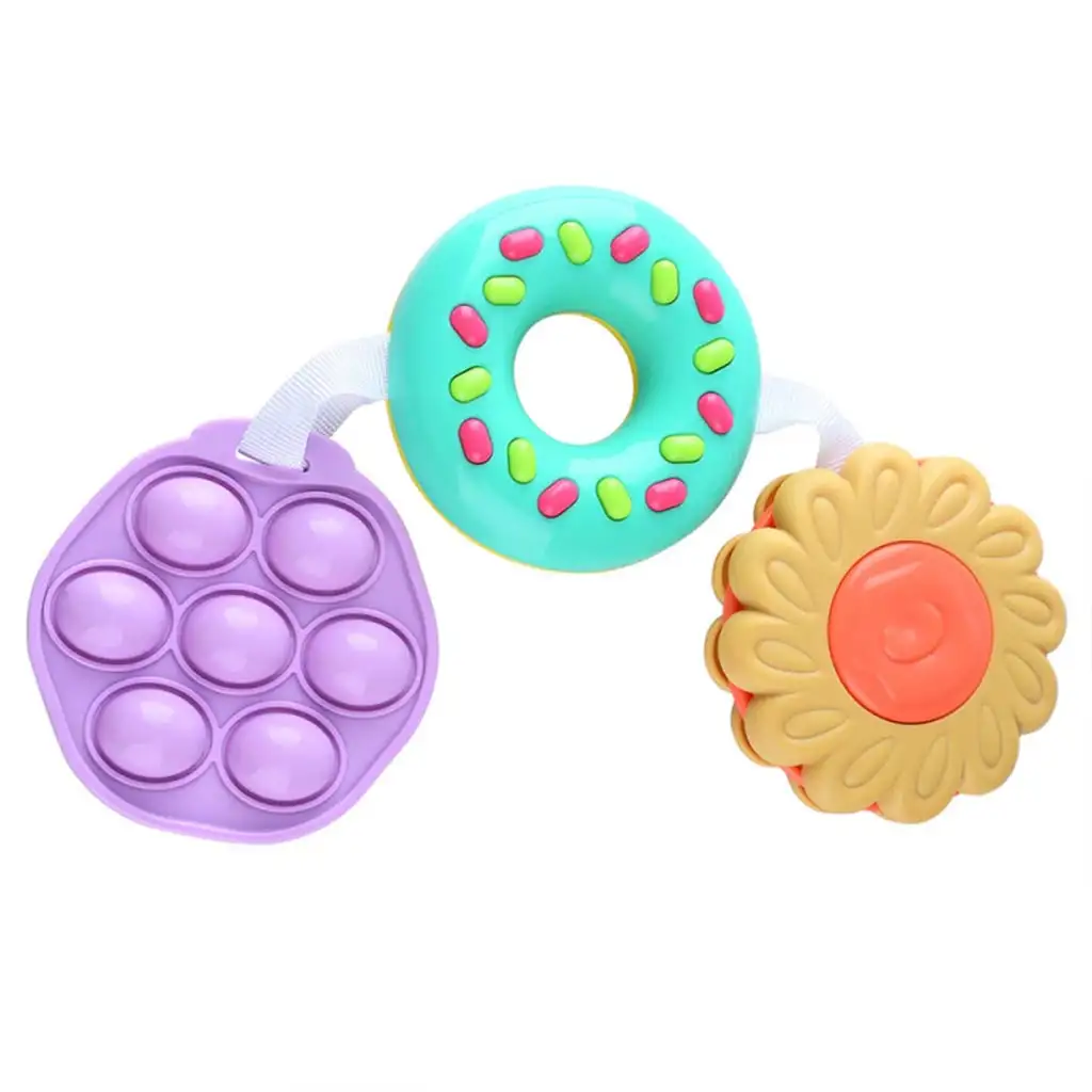 Prvým členom Tria je fialový "pop it" bublinkový panel, ktorý poskytuje nekonečnú zábavu pre bábätko. Stláčanie gombíkov je nielen zábavné, ale tiež pomáha rozvíjať jemnú motoriku. Druhým prvkom je hračka v tvare cukrovej šišky, ktorá svojimi veselými farbami a detailným dizajnom upúta pozornosť detí a podporuje rozvoj zraku. Tretím prvkom je hrkálka v tvare usmievajúceho sa kvetu, ktorá svojím príjemným zvukom rozvíja sluch a porozumenie príčinných súvislostí.