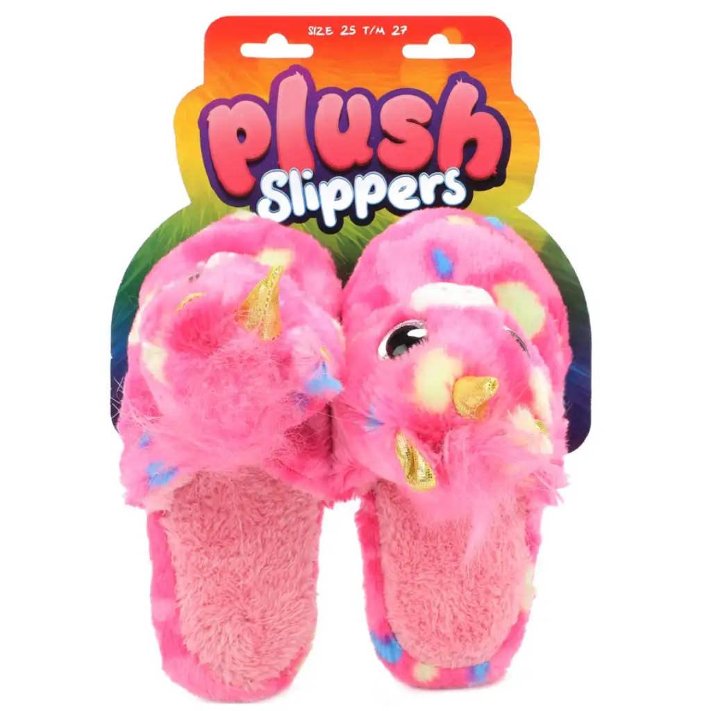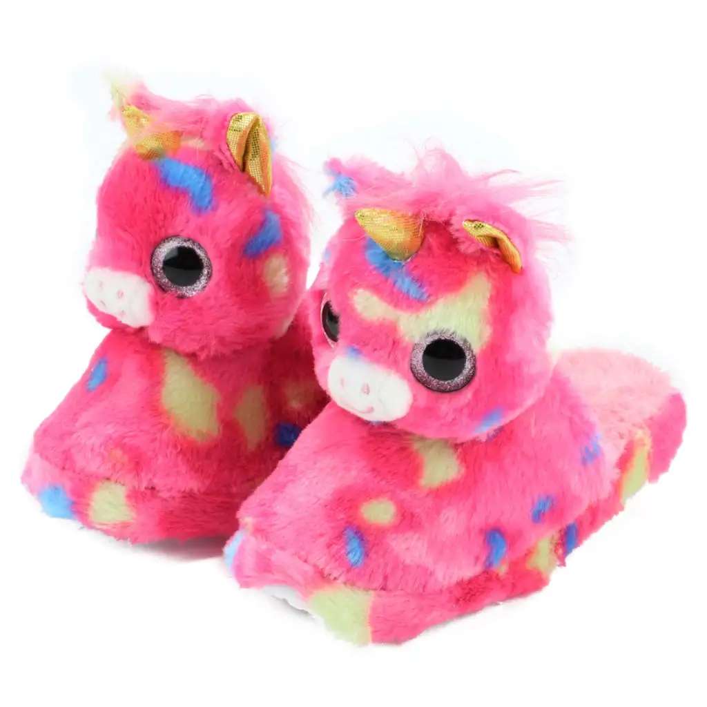 Ak tvoj dieťa miluje jednorožce, tieto rozkošné plyšové papuče si zamiluje! Papuče v tvare hlavy jednorožca s ružovým základom a dúhovými škvrnami nielenže vyzerajú rozkošne, deťom tiež poskytujú teplý a pohodlný pocit pri nosení. Mäkký, chlpato plyšový materiál rozmaznáva malé nôžky a protišmyková podrážka sa postará o bezpečnosť pri používaní doma. Ideálna voľba na chladnejšie dni alebo pyžamové párty!