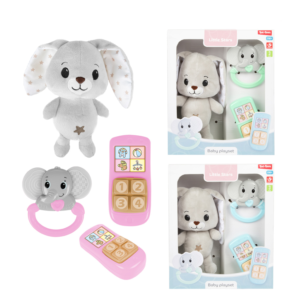 A Little Stars plyšový zajačik s hrkálkou a telefónom je rozkošný a všestranný hrací set, ktorý je perfektnou voľbou pre najmenších. Mäkký, milý plyšový zajačik sa rýchlo môže stať obľúbeným spoločníkom na spanie a hranie bábätka, pretože je vyrobený z príjemného materiálu na dotyk, takže je ideálny na objímanie a upokojenie. V sade sa nachádza hrkálka v tvare slona, ktorú malé ručičky ľahko uchopia, zatiaľ čo jemné zvuky upútajú pozornosť dieťatka a pomáhajú rozvoju sluchu.
