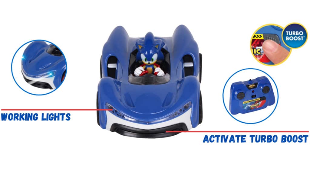 Pre fanúšikov Sonic univerza poskytuje jedinečný zážitok, keď sa ich obľúbená postava zapletie do nových dobrodružstiev, aj keď sa to deje vo forme automobilových pretekov. Jazda autom dáva Sonicovi príležitosť ukázať svoju novú stránku a hráčom ponúka nové výzvy. Vzrušenie z automobilových pretekov a vášeň pre rýchlosť dokonale zapadajú do Sonicovej postavy, ktorá bola vždy známa svojou rýchlosťou.Sonic sedí za volantom ako neodstrániteľná figúrka, zatiaľ čo priľnavé, pogumované pneumatiky na červených kolesách zabezpečujú priľnavosť na ceste. LED svetlomety sú zábavné doplnky a sú ideálne na nočné pretekanie! Dizajn vozidla je nielen estetický, ale aj funkčný, pretože stabilita a vizuálna atraktívnosť boli dôležitými aspektmi pri navrhovaní. Dôraz na detaily, ako je charakteristická modrá farba Sonica a dynamický dizajn, robí herný zážitok ešte vzrušujúcejším.