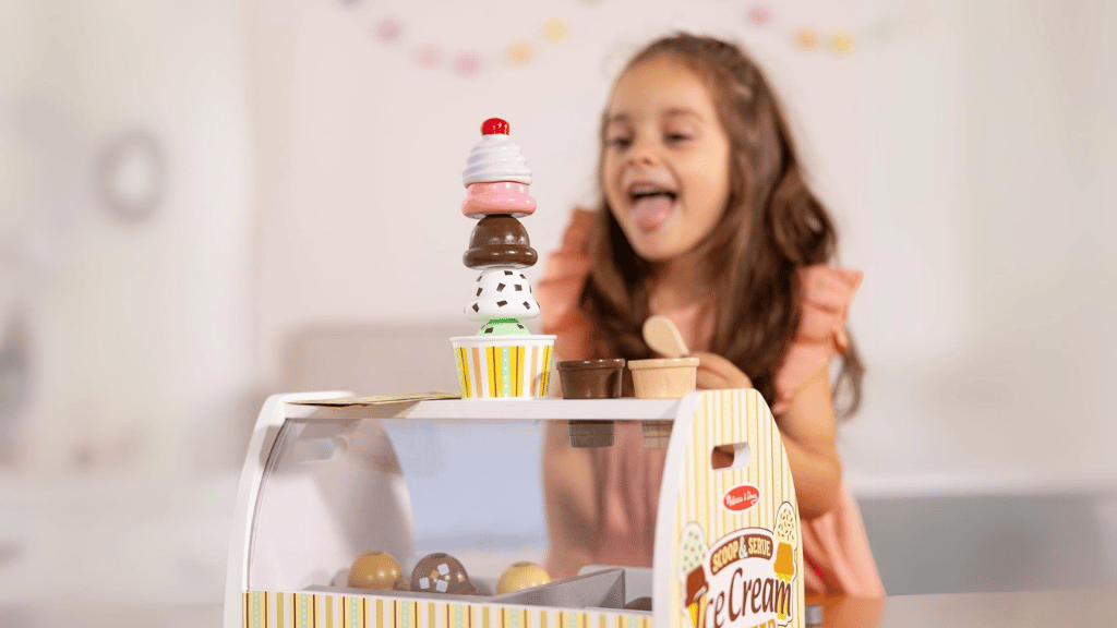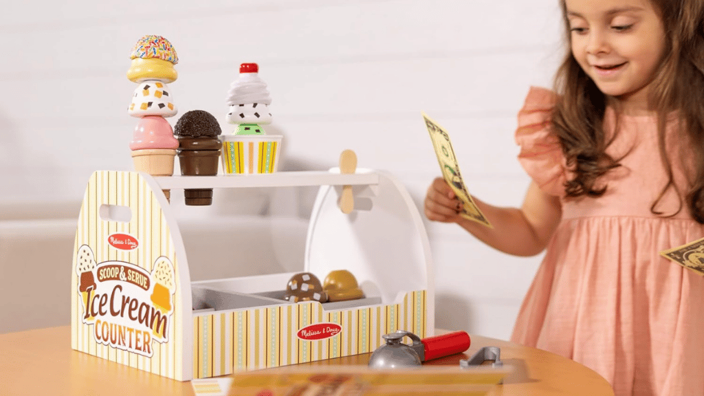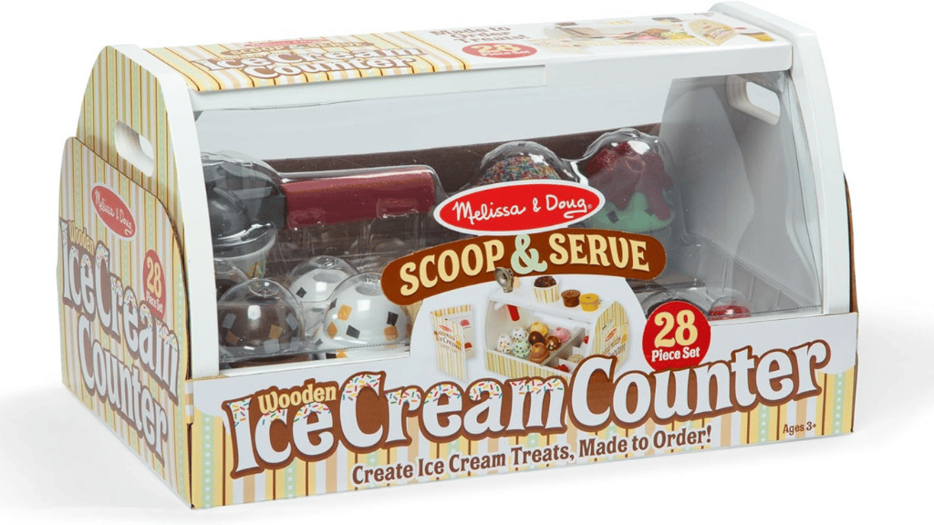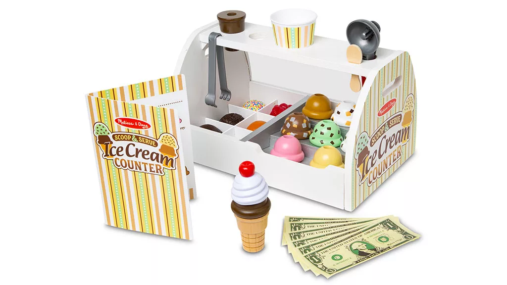 Ponorte sa do sladkého sveta hrania rolí s pomocou **Melissa & Doug Scoop and Serve Ice Cream Counter**! Táto rozkošná súprava obsahuje robustný drevený pult, ktorý je vybavený všetkým, čo deti potrebujú na prevádzkovanie vlastného **zmrzlinového obchodu**. Od ôsmich rôznych príchutí zmrzlinových kopčekov, cez polevy, kornútky a servírovacie nástroje, táto súprava podporuje **kreativitu** a spoločenskú hru. Malí môžu prijímať objednávky na opakovane použiteľnej menu karte, naberať a vrstviť zmrzlinu a objavovať imaginárne **scenáre hrania rolí**.