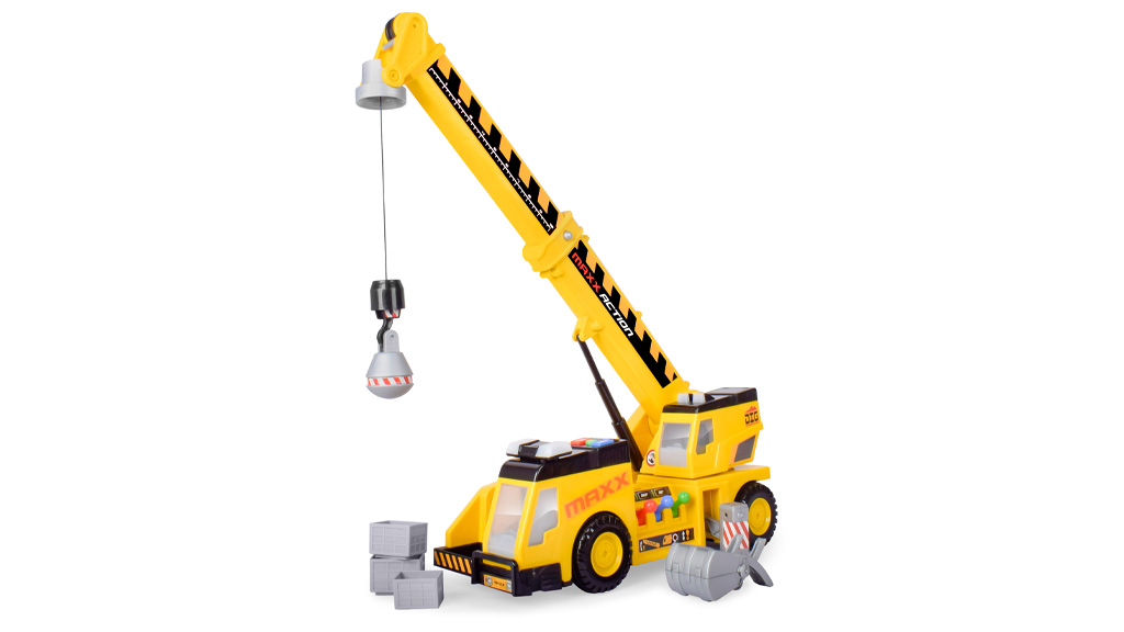 Sunny Days Entertainment Maxx Action 3 v 1 Žeriavový nákladný automobil ponúka 27-palcovú stavebnú hru. Deti môžu jednoducho používať joystickové ovládače na zdvíhanie, lámanie a presúvanie stavebných kociek! Žeriavový nákladný automobil má tri doplnky — lyžicu, hák a demolačnú guľu —, takže deti môžu hrať rôznymi spôsobmi. Žeriavový nákladný automobil sa otáča o 360 stupňov, zdvíha až do výšky 30 palcov a pohybuje sa dopredu a dozadu stlačením tlačidla. Okrem toho má blikajúce svetlá a realistické stavebné zvuky.