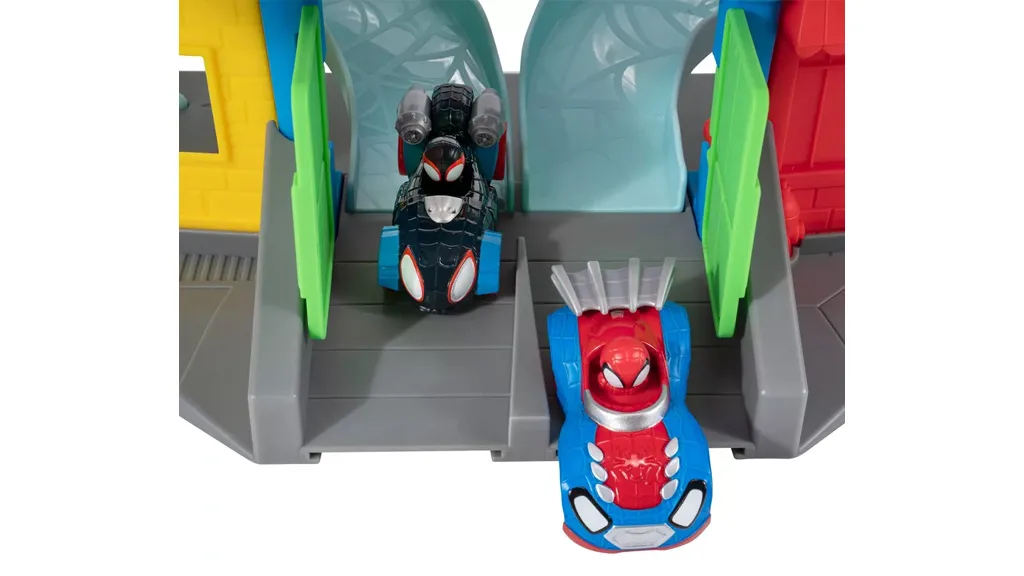 Je tam veľa zákrut a otáčok, a časti trate sa budú pohybovať, aby sa spojili s inými časťami, keď sa s nimi stretnú auto rýchlosťou. Cieľom je, aby vozidlo prešlo cez pasce zločincov.Táto súprava hier obsahuje viacero pohyblivých častí, ktoré umožňujú vozidlám interagovať, keď prechádzajú po tratiach, čo robí čas strávený hraním zábavným a zaujímavým. Deti si užijú "porážanie zloduchov" zo svojho obľúbeného programu, keď vozidlá Spidey a Miles Morales prechádzajú cez pasce.