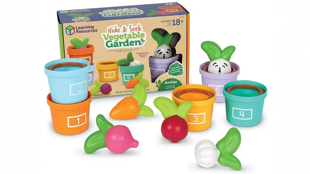 Hádanky a Zeleninová záhrada je sada 10 hier, ktorá motivuje deti cvičiť počítanie, hromadenie a triedenie. Obsahuje päť pastelových, číslovaných kvetináčov a gumové zeleniny, vrátane strúčika cesnaku, oranžovej mrkvy, cvikly a reďkovky. Deti môžu tiež nájsť priateľa v piatom kvetináči: Veselého zajaca!