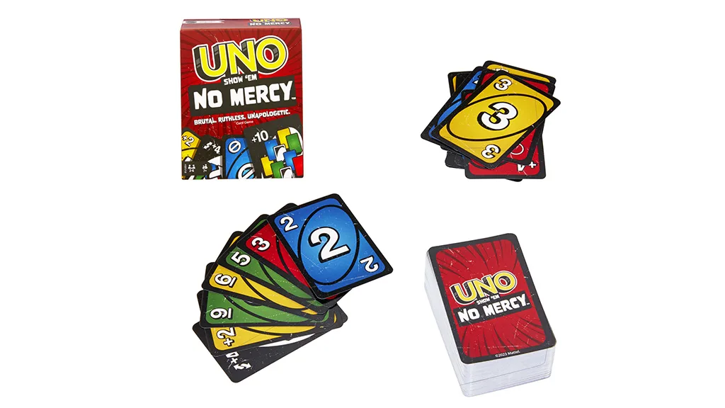 UNO - Bez milosti! Neúprosný zvrat v obľúbenej hre sveta, UNO. Táto verzia pridáva 56 nových kariet a špeciálne pravidlá pre priebeh hry. Hráči nájdu tvrdšie akčné karty ako Vynechanie všetkých a Ťahanie 10 kariet.