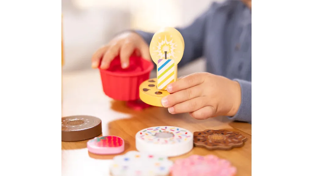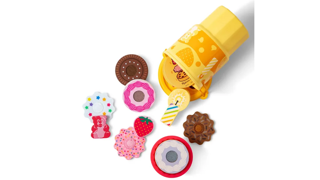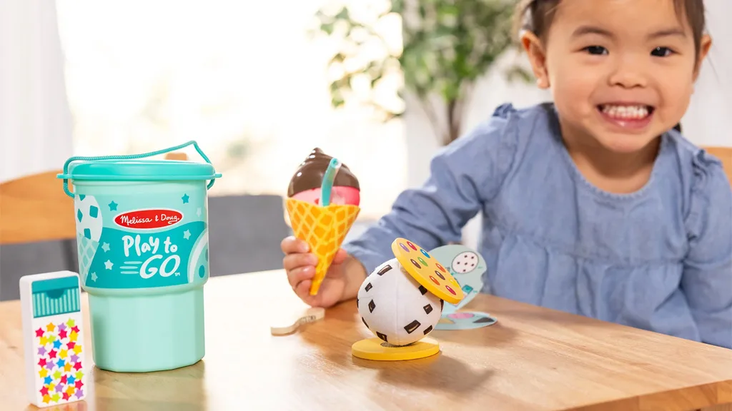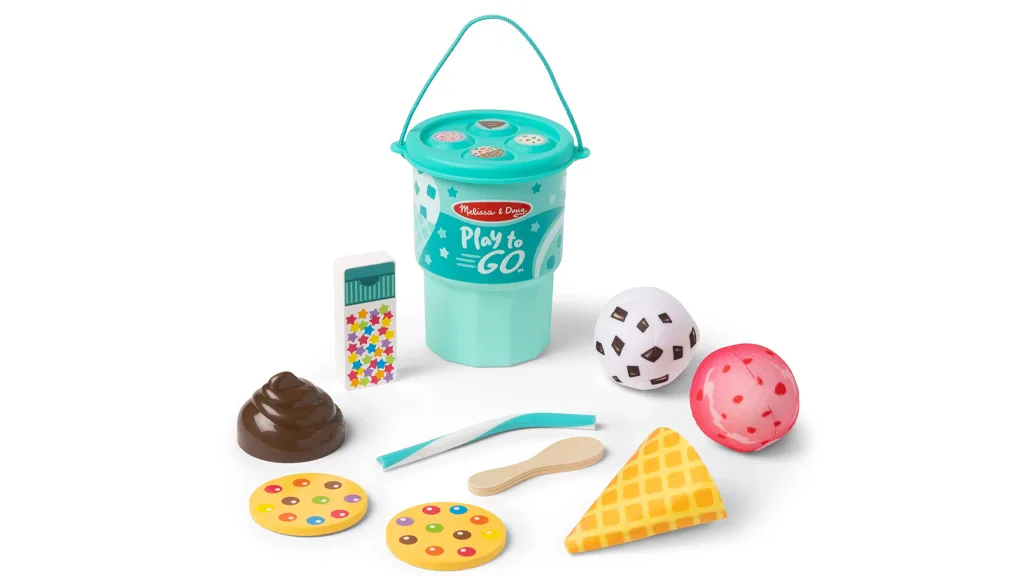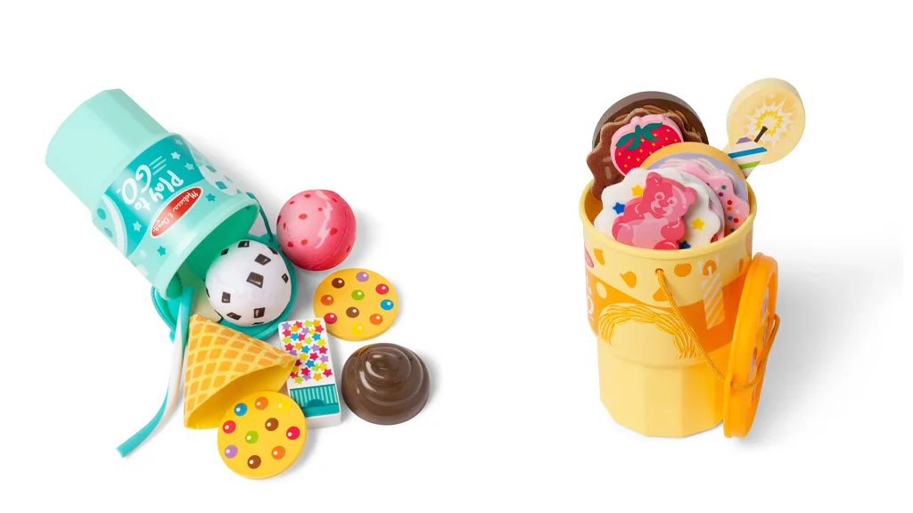 Hračkové sady Melissa & Doug Play To Go boli navrhnuté tak, aby si ich deti mohli vziať so sebou na svoje cesty a dobrodružstvá. Sada Cookies & Cake obsahuje 12 kusov, vrátane troch vrstiev filcovej polevy, obalu na cupcake, obojstrannej drevenej sviečky, troch obojstranných vrstiev sušienok a torty, drevenej jahody a dreveného gumového medvedíka. Medzi umelé chute patrí čokoláda, jahoda, vanilka a ďalšie.Súprava na hranie zmrzliny obsahuje 11 kusov, vrátane dvoch mäkkých plyšových zmrzlinových gombíkov, jedného filcového zmrzlinového kornúta, plastovej čokoládovej polevy, nádoby s dvojitým sitkom, pruhovaného plastového slamky, drevenej lyžice a dvoch drevených pečív.
