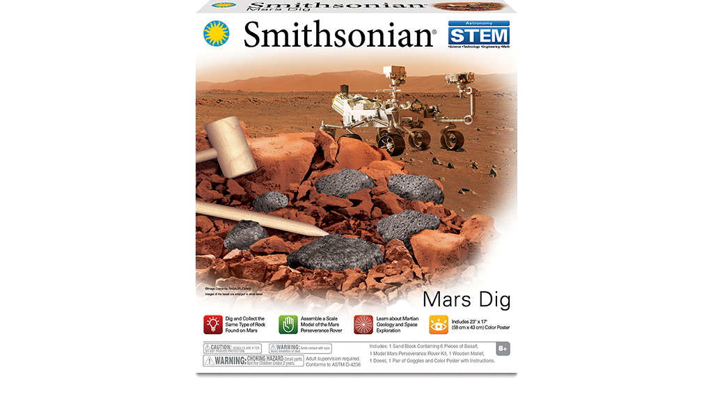 Smithsonian Mars Dig od NSI International obsahuje všetky potrebné nástroje, ktoré umožňujú deťom objavovať skaly, ktoré možno nájsť aj na Marse. Deti vo veku 8 rokov a staršie môžu odstraňovať piesok z bloku, aby objavili šesť kusov bazaltu. Okrem toho môžu zostaviť svoj vlastný model v mierke vozidla Perseverance rover, ktoré zbieralo vzorky skál, aby ich prinieslo späť a študovalo ich na Zemi. Súprava obsahuje aj plagát, na jednej strane s množstvom informácií a na druhej strane s pokynmi.Deti sa učia mnohé pojmy z oblasti STEAM, ako sú geológia, vesmírny výskum, astronómia a mnoho ďalších. Môžu čítať o marsovskom vozidle Perseverance a o dôležitosti jeho misie, zatiaľ čo sa prakticky a skúsenostne zoznamujú s horninami a sedimentmi na Marse. Montáž vozidla je jednoduchá a rýchla – diely sa jednoducho zacvaknú na svoje miesto a deti môžu študovať jednotlivé súčasti a spoznávať ich funkcie. Po dokončení „vedeckého výskumu“ (kopanie hornín) môžu deti pridať svoje nové horniny do svojej zbierky!