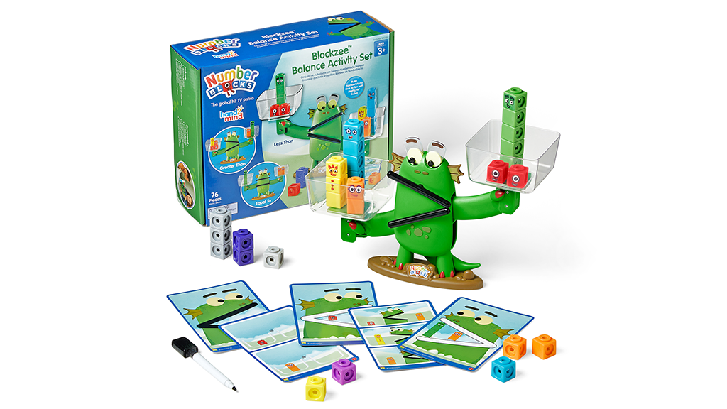 Sada aktivít Blockzee Balance s monštróznou váhou obsahuje monštróznu váhu, ktorá pomáha deťom spoznávať čísla a hodnoty. Sada obsahuje Blockzee váhu, dve priehľadné vedrá, 10 obojstranných aktivitných kariet, 61 kociek MathLink (v 12 rôznych farbách na stavbu číselných kociek), nálepku s tvárami a suchým zmazateľným fixom.Aktivity karty sú rozdelené do dvoch úrovní: červené karty obsahujú čísla do päť, zatiaľ čo oranžové karty sa zameriavajú na čísla do desať. Deti môžu umiestniť čisté vedrá na ruky Blockzee, a potom podľa vizuálnych pokynov na kartách ich naplniť farebnými Číselnými kockami, aby sa naučili čísla a matematiku. Oči, ústa a ruky príšery sa budú hýbať pri porovnávaní čísel; ústa sa otvoria smerom k vedru obsahujúcemu väčšie číselné bloky, aby reprezentovali symbol "väčšie ako" a ukázali aj symboly "menšie ako" a "rovná sa".Počas hrania sa s hračkami sa deti učia a rozvíjajú matematické zručnosti, vrátane počítania, porovnávania čísel, sčítania a identifikácie čísel zábavným a vzrušujúcim spôsobom. V zošite sa nachádza viacero aktivít na oboch úrovniach, takže rodičia a deti môžu ihneď začať s učením.Keďže deti musia fyzicky umiestniť bloky a vidieť, ako sa príšera pohybuje podľa ich pravidiel, pravdepodobne si lepšie zapamätajú matematickú lekciu. Pohybom a usporiadaním blokov, ako to vyžaduje nastavenie, môžu opatrovatelia predísť neklidu, ktorý by mohol vzniknúť počas sedenia na matematike, zatiaľ čo deti si brúsia svoje jemné motorické zručnosti.