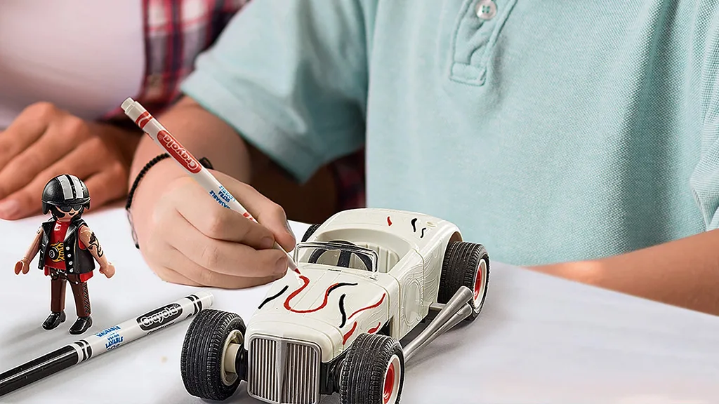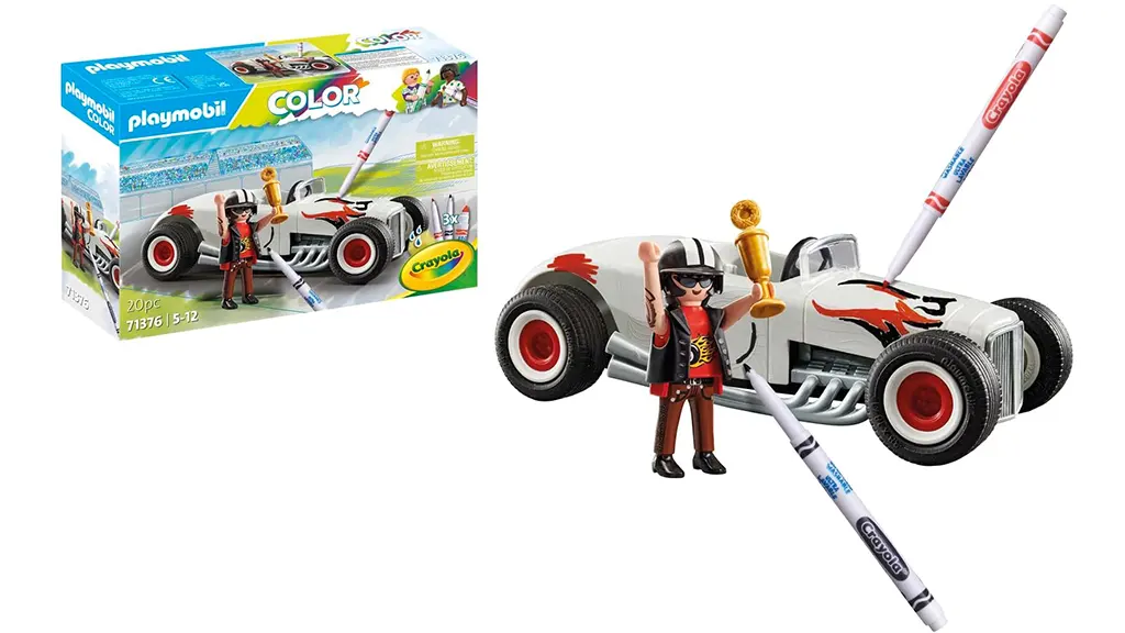 Deti môžu svoje závodné autá opakovane prispôsobiť podľa svojho vkusu. Táto sada Playmobil Color obsahuje fixky Crayola, ktoré sú umývateľné, takže malí pretekári môžu svoje autá znova navrhnúť. Balenie obsahuje aj figúrku pilota, trofej a špongiu, ktorá pomáha odstrániť farbu, ak je to potrebné.