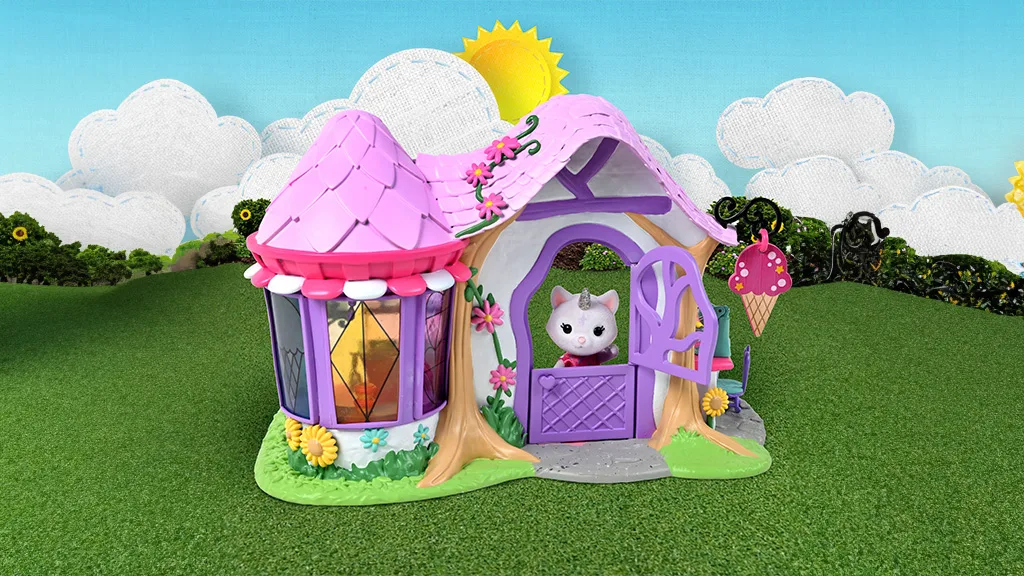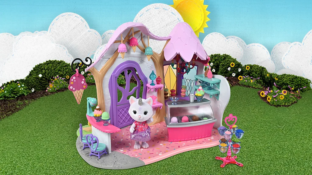 Dúha Hrebeň je najčarovnejšie miesto v Honey Bee Acres, ktoré poskytuje domov rozkošným, maznateľným, chlpatým figúrkam, ktoré deti budú milovať zbierať. Zmrzlinový salón Honey Bee Acres: Dúhový Kryštál je plný imaginárnej hry a obsahuje Kryštálového jednorožca-mačku a 36 kusov, s ktorými možno vytvoriť super sladké imaginárne kornúty, tanieriky a banánové štiepy pre Kryštála a BFF z Honey Bee Acres. Súprava obsahuje otáčajúci sa displej, pult so zmrzlinou a stoličky, malé doplnky, guličky zmrzliny a oveľa viac. Zmrzlinový obchod sám o sebe žiari v šik ružovej a fialovej farbe, 3-palcová figúrka Kryštála má pohyblivú hlavu, ruky a nohy.
